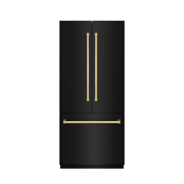 ZLINE Autograph Edition 36 in. 19.6 cu. ft. French Door Built-In Bottom Freezer Refrigerator with Water Dispenser and Ice Maker in Black Stainless Steel with Graphite Gray Interior and Polished Gold Accents (GRBIVZ-BS-36-G)