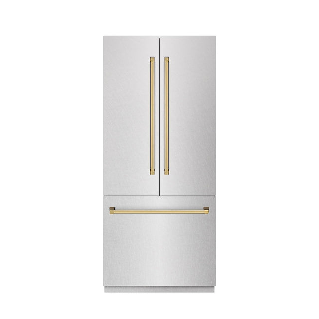 ZLINE Autograph Edition 36 in. 19.6 cu. ft. French Door Built-In Bottom Freezer Refrigerator with Water Dispenser and Ice Maker in DuraSnow® Stainless Steel with Graphite Gray Interior and Polished Gold Accents (GRBIVZ-SN-36-G)