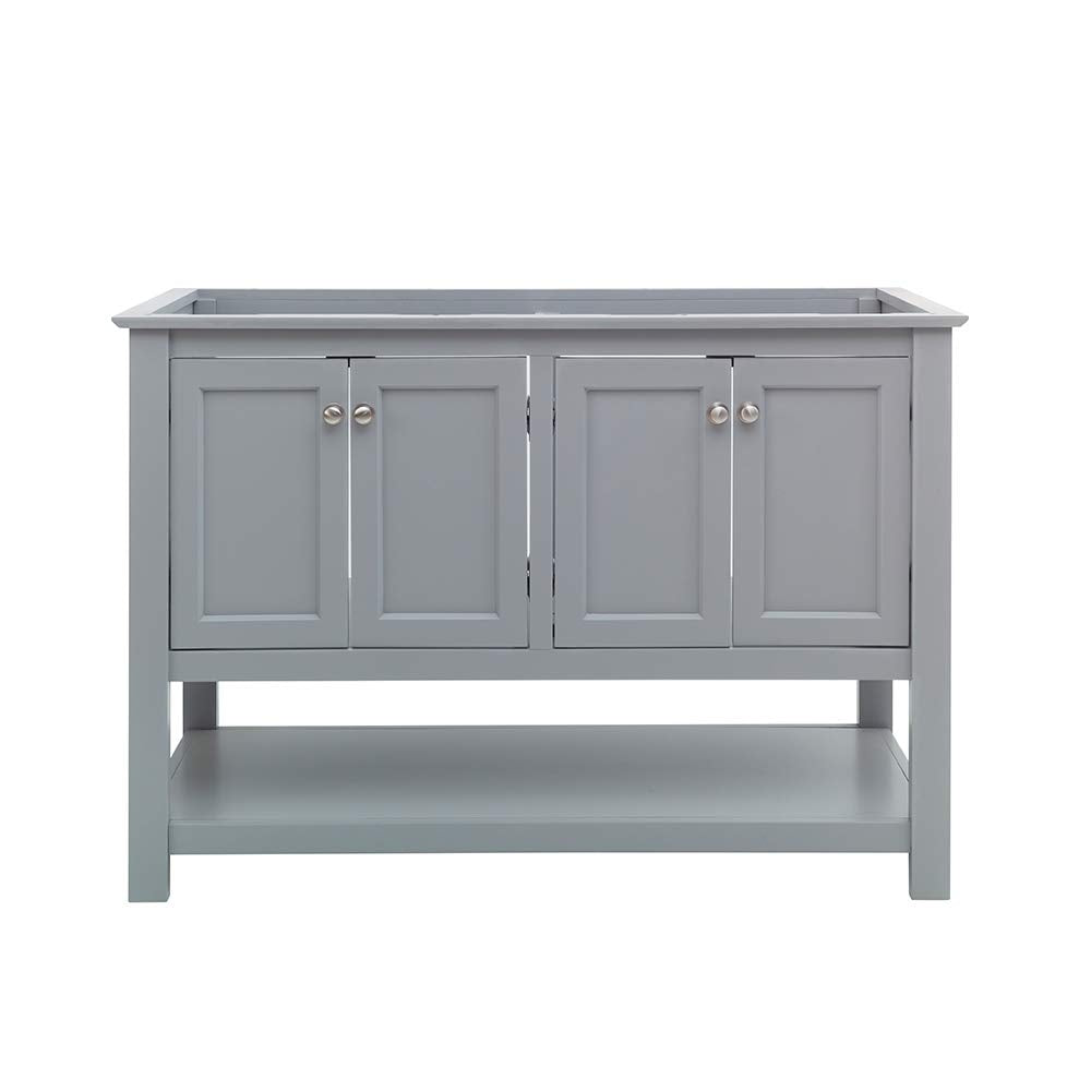 Add instant style and classic charm to your bathroom with the clean, timeless design of our Fresca Manchester 48” Traditional Double Sink Bathroom Cabinet. This beautifully constructed cabinet features solid wood doors that open to reveal two roomy compartments for organizing products of varying sizes and keeping all of your bathroom essentials within reach. Soft close hinges ensure the doors close silently and effortlessly every time. Open bottom shelves are ideal for storing towels and additional bath supplies. This traditional cabinet has an elegant, painted Gray finish and brushed nickel handles. It includes installation hardware and is available in several sizes and finishes to meet your decorating needs.