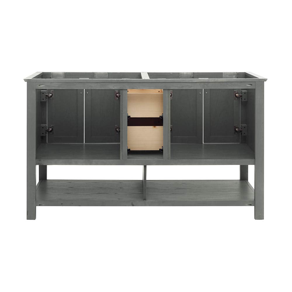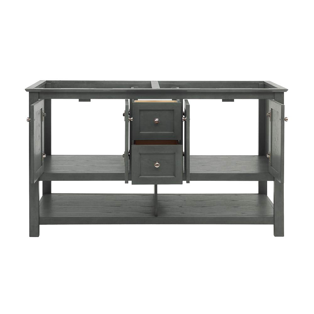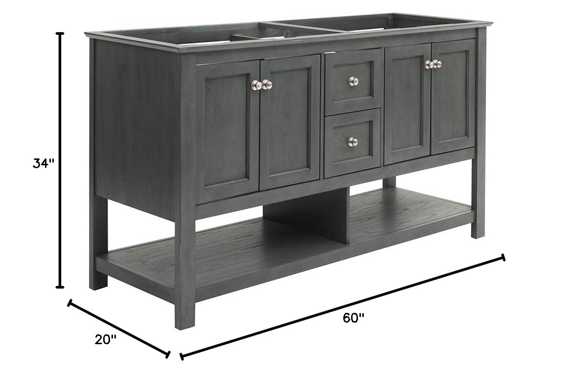 Add a sophisticated touch to your bathroom with the clean, timeless design of our Fresca Manchester Regal 60 Traditional Double Sink Bathroom Cabinet. This beautifully constructed cabinet features solid wood doors that open to reveal two roomy compartments for organizing products of varying sizes and two soft closing drawers for additional out-of-sight storage. Soft close hinges ensure the doors close silently and effortlessly every time. Open bottom shelves are ideal for storing towels and additional bath supplies. Designed to elevate any décor scheme, this traditional cabinet has an elegant, Gray Wood Veneer finish and brushed nickel handles. It includes installation hardware and is available in several sizes and finishes to meet your decorating needs.