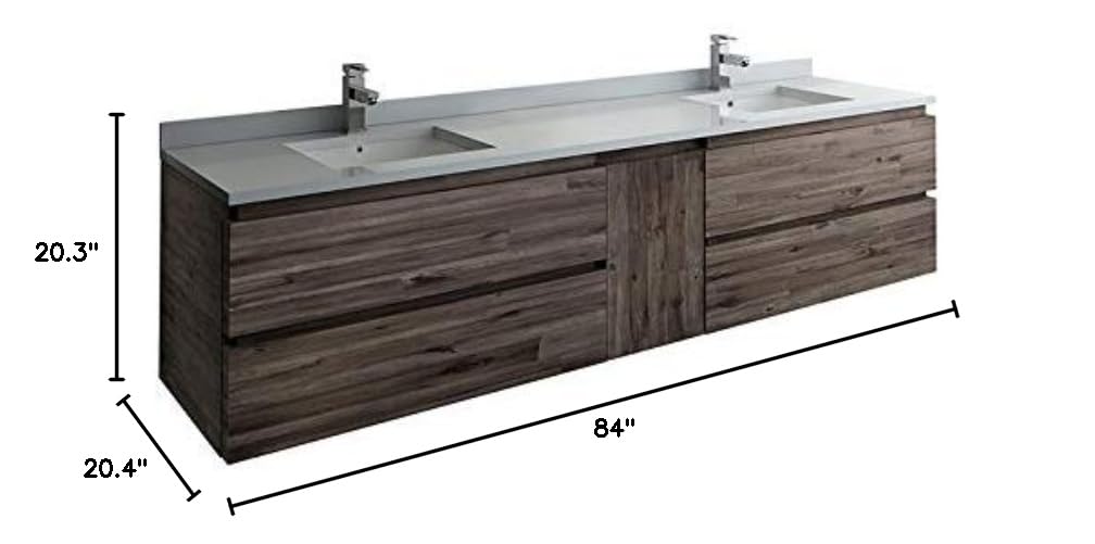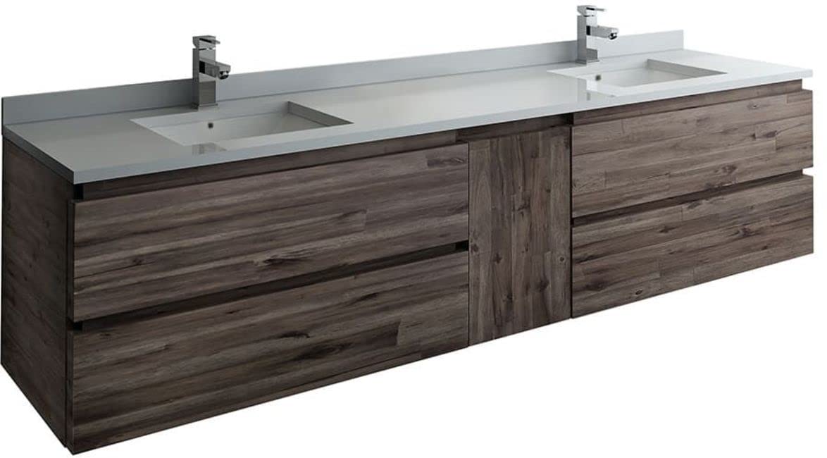 The Fresca Formosa 84" Wall Hung Double Sink Modern Bathroom Cabinet with Top and Sinks is superbly crafted of solid Acacia wood, known for its magnificent beauty and durability. It has a warm gray finish with a hint of brown throughout, and a natural grain that will inject luxurious warmth into any space. A masterpiece of elegance and style, this wall-mounted cabinet measures 84" in width. With solid wood, soft-closing dovetail drawers and a roomy center cabinet that's perfect for shampoo bottles, towels or other essentials, this bathroom cabinet features tons of storage. The solid pine drawers are clear coated and feature a mitered, wrap-around design that adds to the superior detailing. Cove routed pulls are carved directly into the drawers and cabinet door, keeping the design sharp and sophisticated. Gracing the top of the vanity is a stunning quartz stone countertop and two ceramic undermount basins. Each white ceramic basin is equipped with an overflow and the countertop has been pre-drilled to accommodate single hole faucets (sold separately). This Fresca Formosa Wall Hung Double Sink Modern Bathroom Cabinet with Top and Sinks is available in multiple sizes and styles. It includes installation hardware.