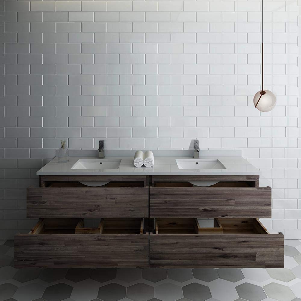 The Fresca Formosa Wall Hung Double Sink Modern Bathroom Cabinet is superbly crafted of solid Acacia wood, known for its magnificent beauty and durability. It has a warm grey finish with a hint of brown throughout, and a natural grain that will inject luxurious warmth into any space. A masterpiece of elegance and style, this wall-mounted cabinet measures 70 in width. With four solid wood, soft-closing dovetail drawers, this bathroom cabinet features tons of storage, ideal for keeping a family organized. The solid pine drawers are clear coated and feature a mitered, wrap-around design that adds to the superior detailing. Cove routed pulls are carved directly into the drawers, keeping the design sharp and sophisticated. The Fresca Formosa Cabinet is available in multiple sizes and styles. It includes installation hardware.