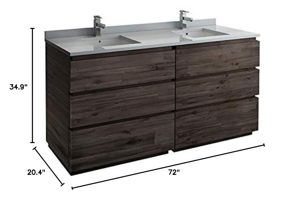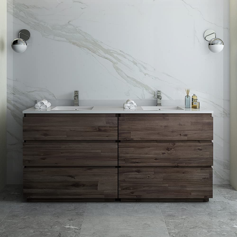 - Materials: Solid acacia wood construction, quartz stone countertop, ceramic undermount sinks with overflow