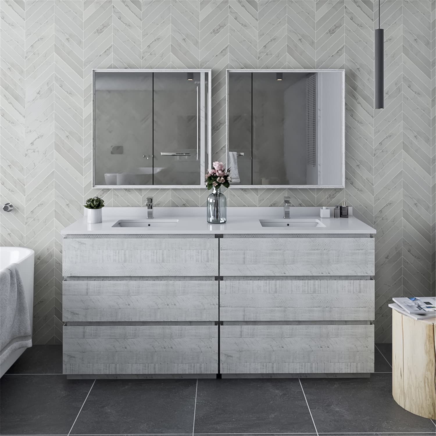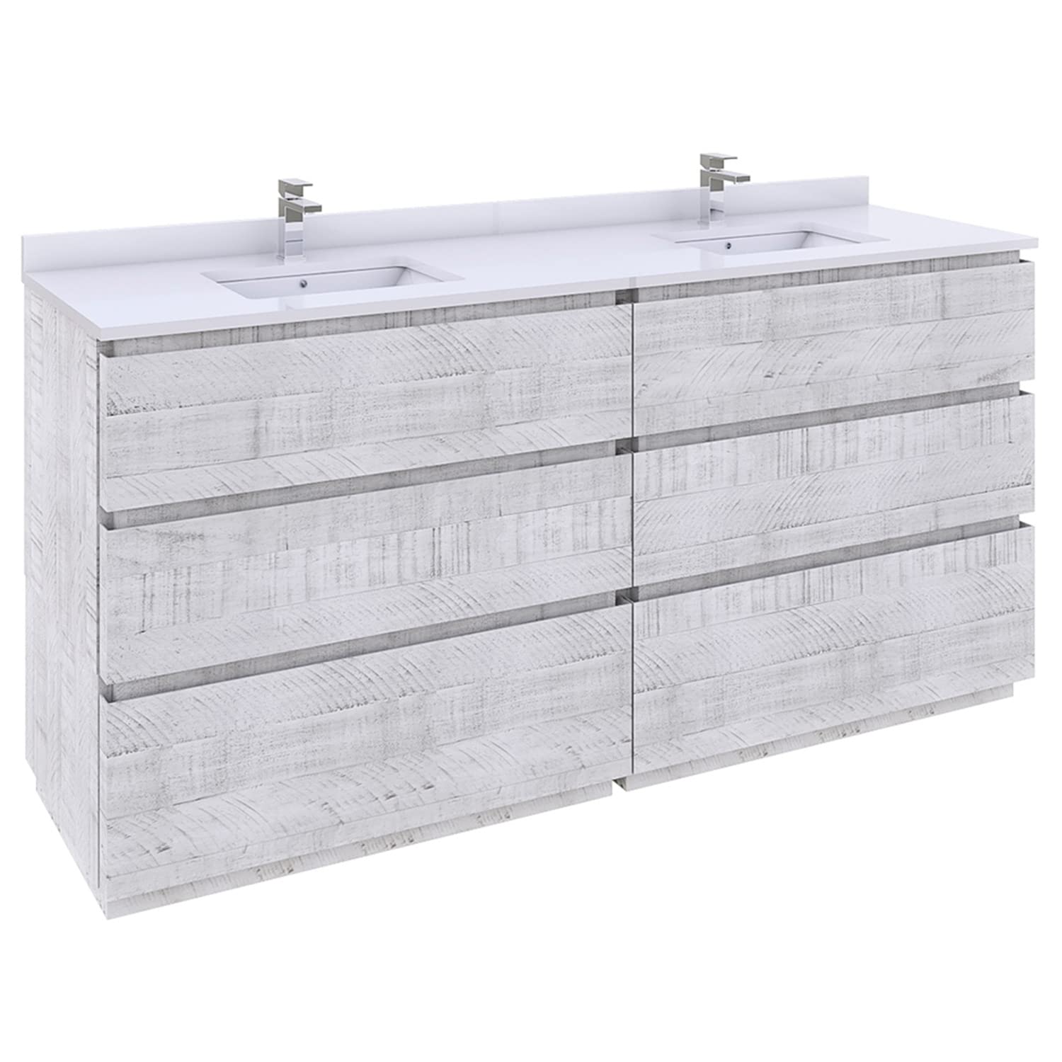 - Materials: Solid Acacia Wood Construction, Quartz Stone Countertop, Ceramic Undermount Sinks w/ Overflow.