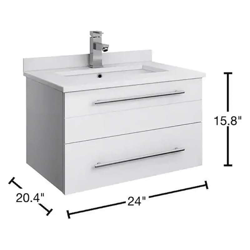 Classically simple with clean lines and a contoured undermount sink, this Fresca Lucera Wall Hung Modern Bathroom Cabinet will bring out the best in any bathroom. Measuring 24 in width, this sophisticated cabinet has one soft-closing drawer with a decorative beveled drawer plate design and slim brushed metal handle. This modern wall hung cabinet has a chic painted White finish. Gracing the top of the cabinet is a striking quartz stone countertop with backsplash and a white ceramic undermount sink. The sink is equipped with an integrated overflow and single hole faucet mount, ready for the faucet of your choice (sold separately). This cabinet includes installation hardware and is available in several sizes and finishes to meet your decorating needs.