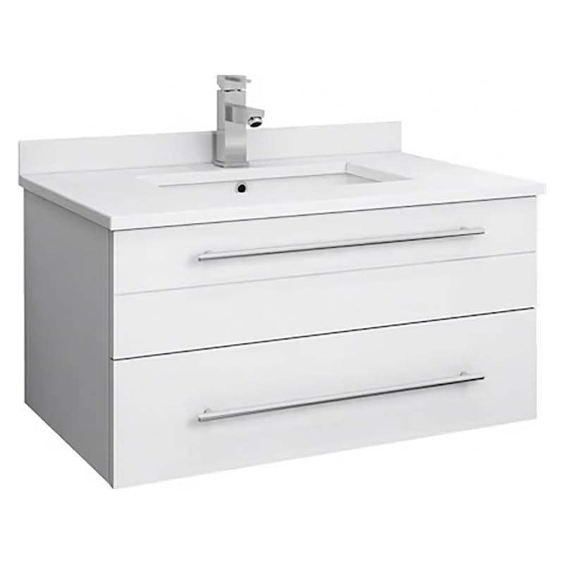 Classically simple with clean lines and a beautiful vessel sink, this Fresca Lucera Wall Hung Modern Bathroom Cabinet will bring out the best in any bathroom. Measuring 30 in width, this sophisticated cabinet has two soft-closing drawers with a decorative beveled drawer plate design and slim brushed metal handles. This modern wall hung cabinet has a chic painted White finish. Gracing the top of the cabinet is a striking quartz stone countertop with a white vessel sink. The sink is equipped with an integrated overflow and single hole vessel faucet mount, ready for the faucet of your choice (sold separately). This cabinet includes installation hardware and is available in several sizes and finishes to meet your decorating needs.