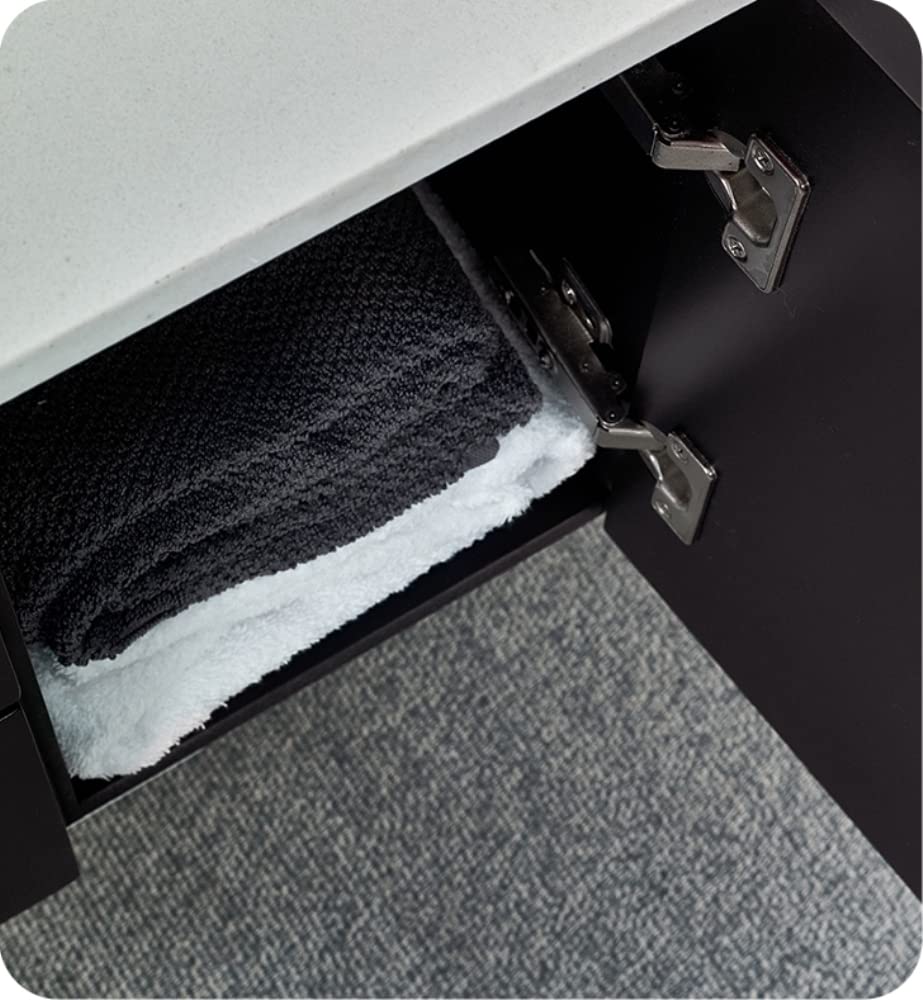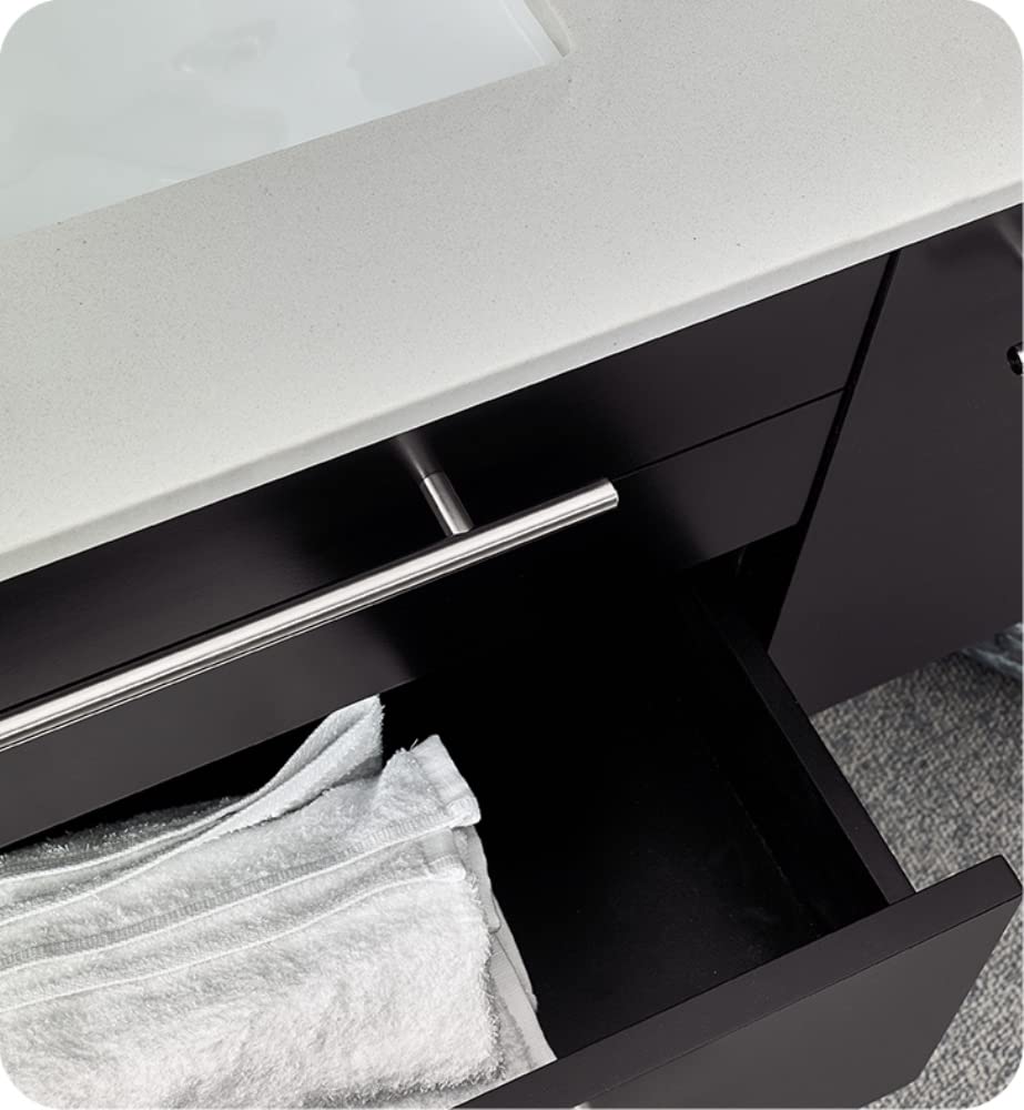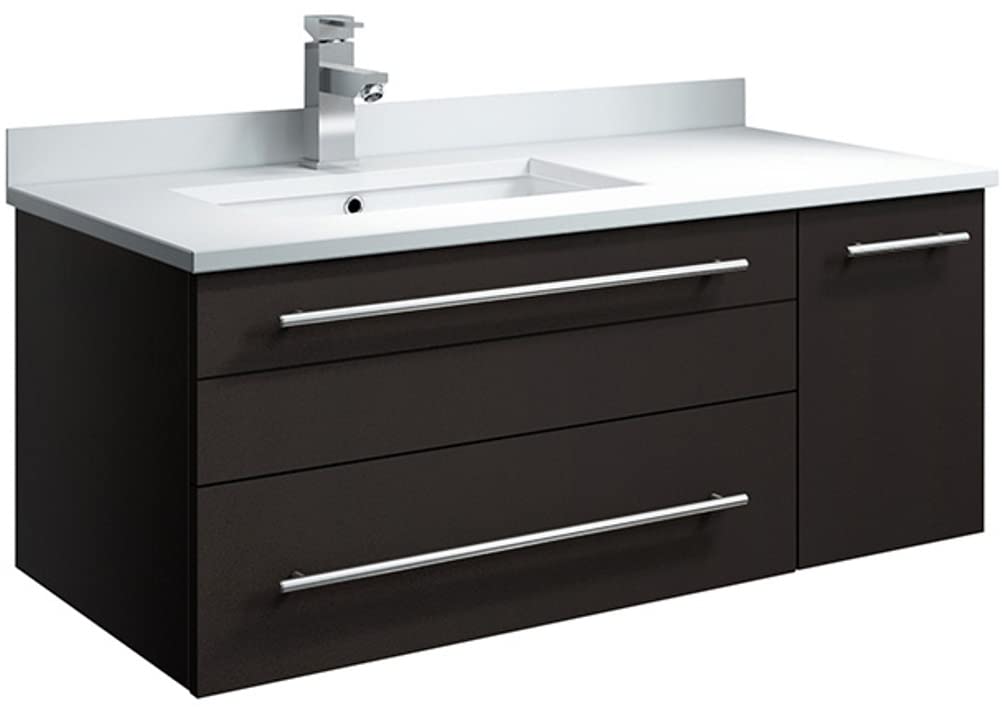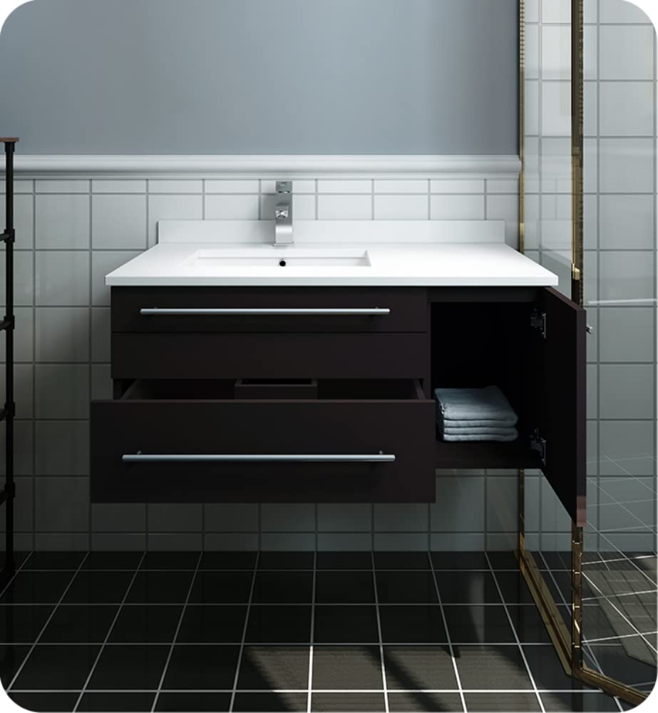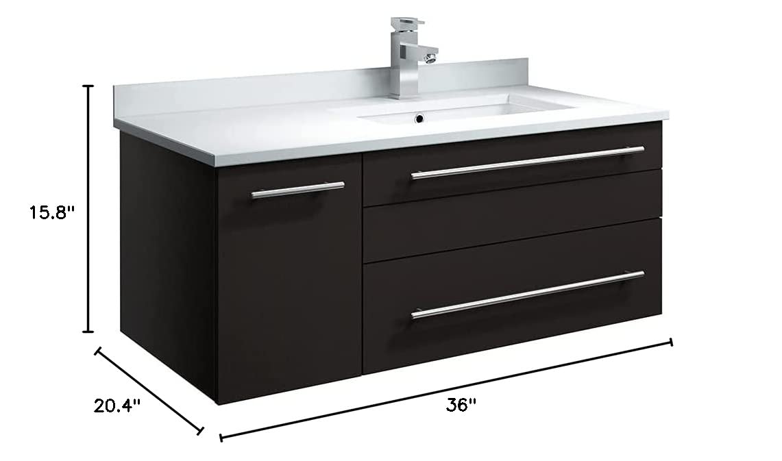 Classically simple with clean lines and a contoured undermount sink, this Fresca Lucera Wall Hung Modern Bathroom Cabinet will bring out the best in any bathroom. Measuring 36 in width, this sophisticated cabinet has a well constructed solid wood frame with a roomy left-side compartment for holding bathroom essentials and a spacious drawer with a decorative beveled drawer plate design. The door and drawer are soft-closing and feature slim brushed metal handles. This modern cabinet has a chic painted Espresso finish. Gracing the top of the cabinet is a striking quartz stone countertop with backsplash and a white ceramic undermount sink. The sink is equipped with an integrated overflow and single hole faucet mount, ready for the faucet of your choice (sold separately). This cabinet includes installation hardware and is available in several sizes and finishes to meet your decorating needs.