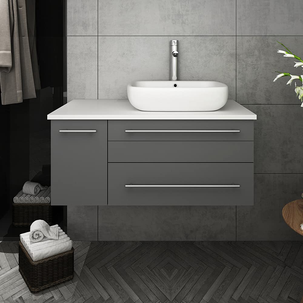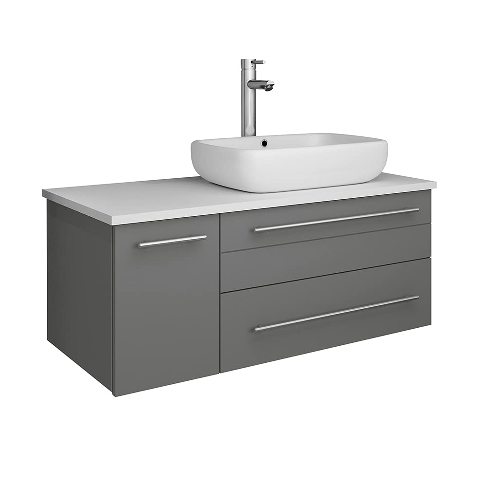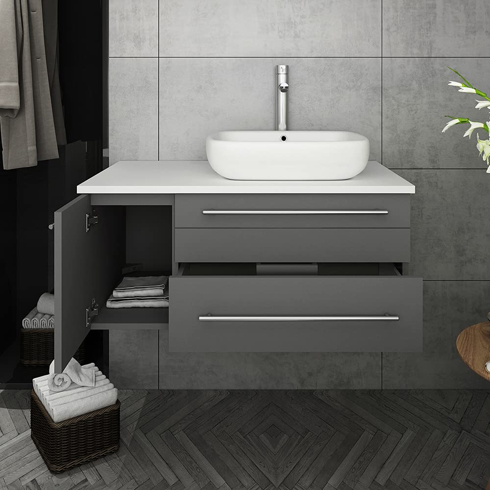 Classically simple with clean lines and a beautiful vessel sink, this Fresca Lucera Wall Hung Modern Bathroom Cabinet will bring out the best in any bathroom. Measuring 36” in width, this sophisticated cabinet has a well constructed solid wood frame with a roomy left-side compartment for holding bathroom essentials and two spacious drawers with a decorative beveled drawer plate design. The door and drawers are soft-closing and feature slim brushed metal handles. This modern cabinet has a chic painted Espresso finish. Gracing the top of the cabinet is a striking quartz stone countertop with a white vessel sink. The sink is equipped with an integrated overflow and single hole vessel faucet mount, ready for the faucet of your choice (sold separately). This cabinet includes installation hardware and is available in several sizes and finishes to meet your decorating needs.