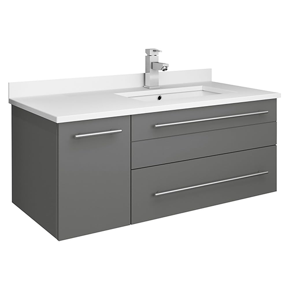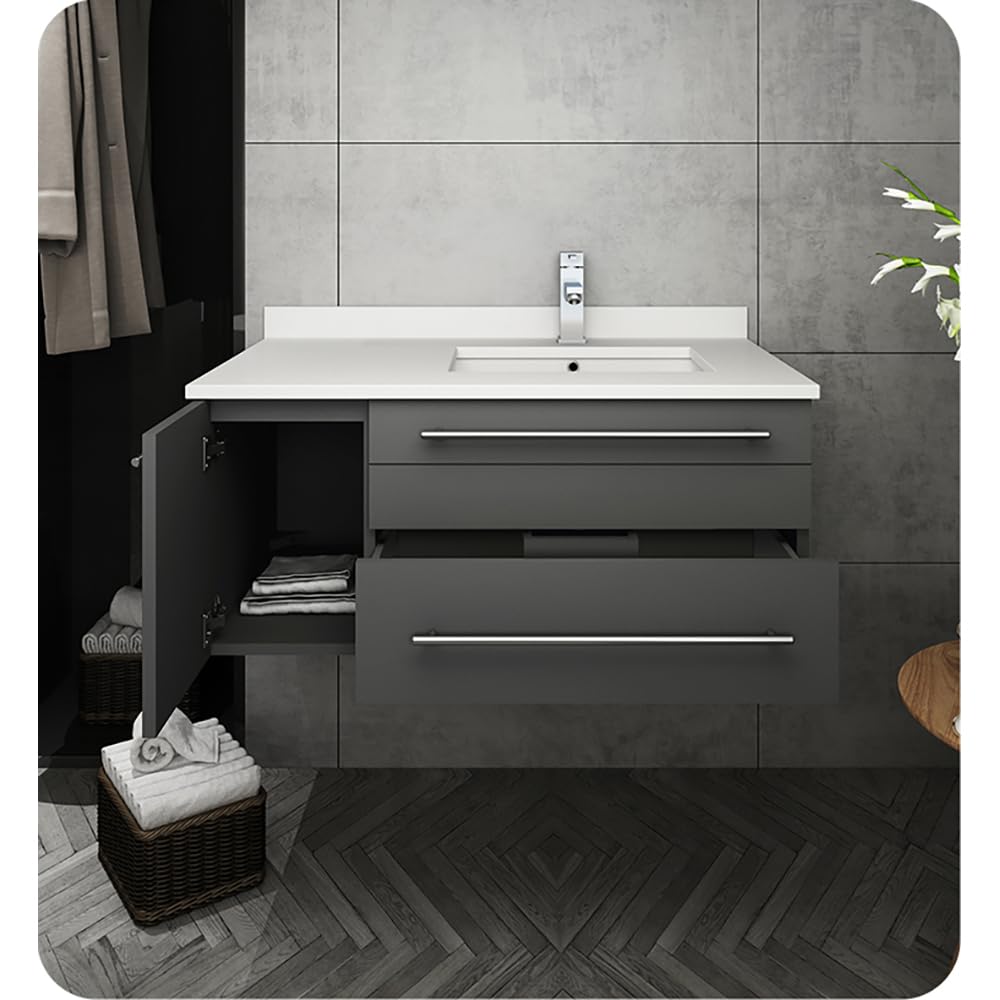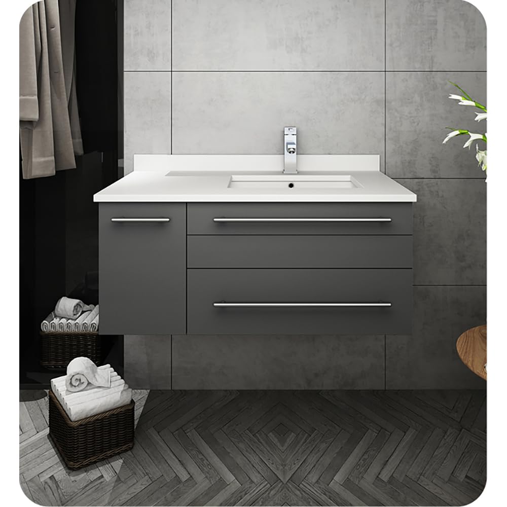 Classically simple with clean lines and a contoured undermount sink, this Fresca Lucera Wall Hung Modern Bathroom Cabinet will bring out the best in any bathroom. Measuring 36 in width, this sophisticated cabinet has a well constructed solid wood frame with a roomy right-side compartment for holding bathroom essentials and a spacious drawer with a decorative beveled drawer plate design. The door and drawer are soft-closing and feature slim brushed metal handles. This modern cabinet has a chic painted Gray finish. Gracing the top of the cabinet is a striking quartz stone countertop with backsplash and a white ceramic undermount sink. The sink is equipped with an integrated overflow and single hole faucet mount, ready for the faucet of your choice (sold separately). This cabinet includes installation hardware and is available in several sizes and finishes to meet your decorating needs.