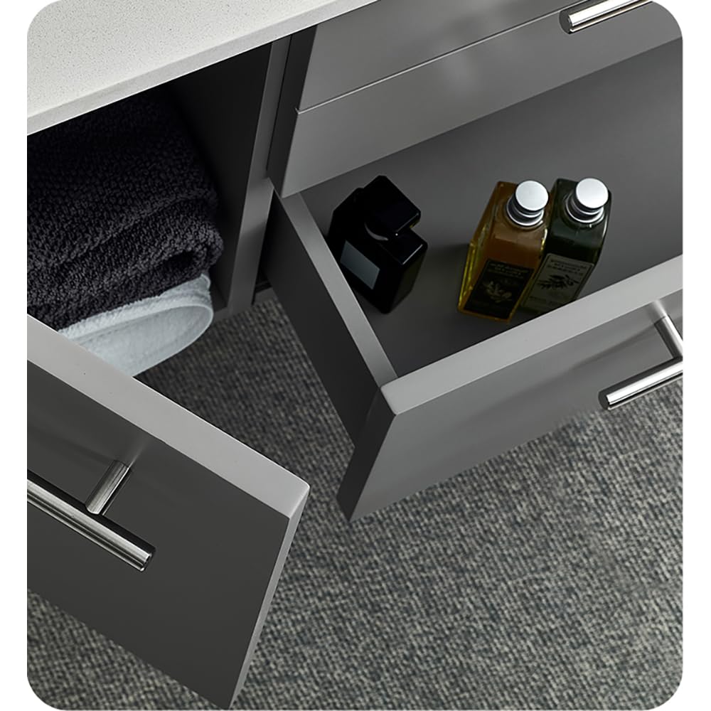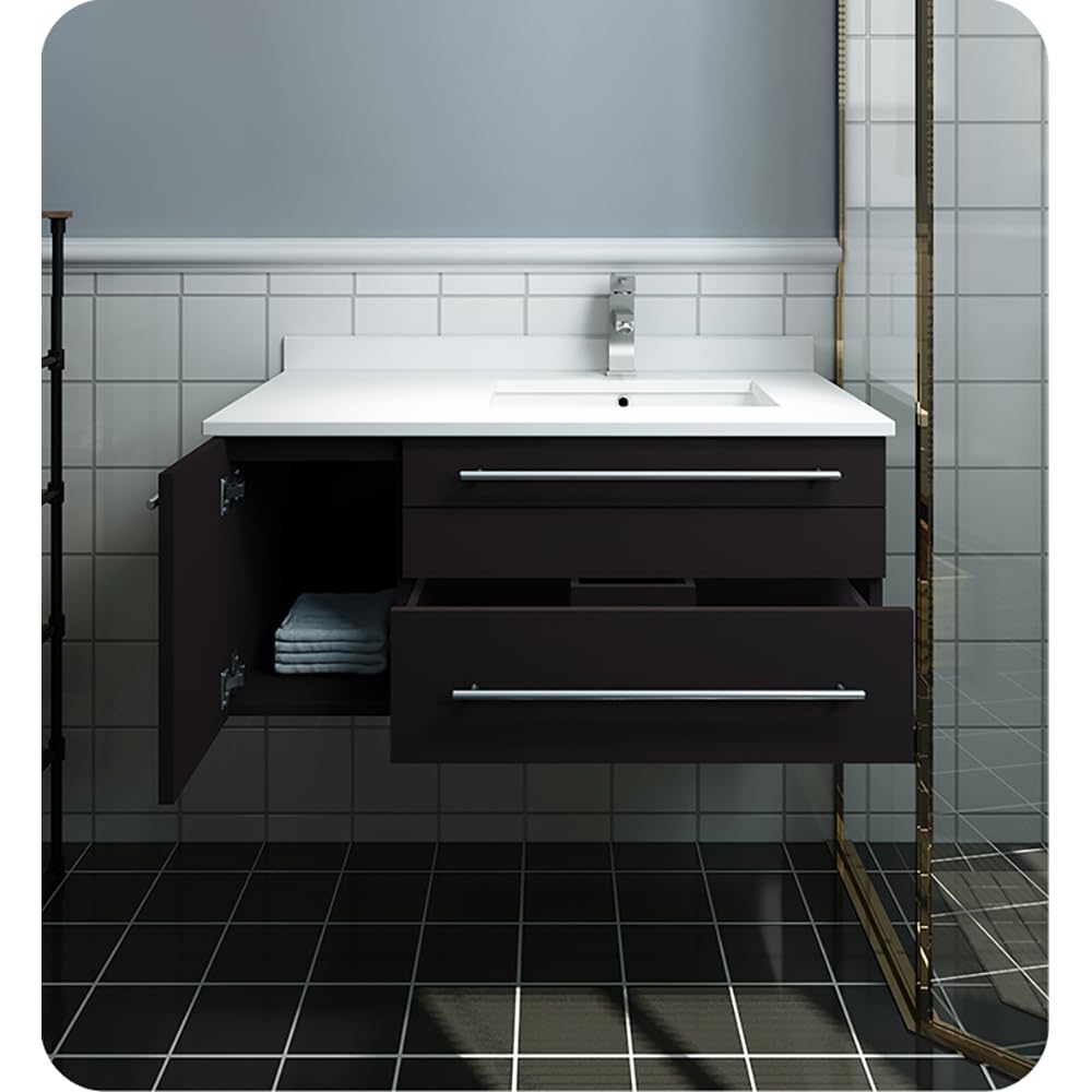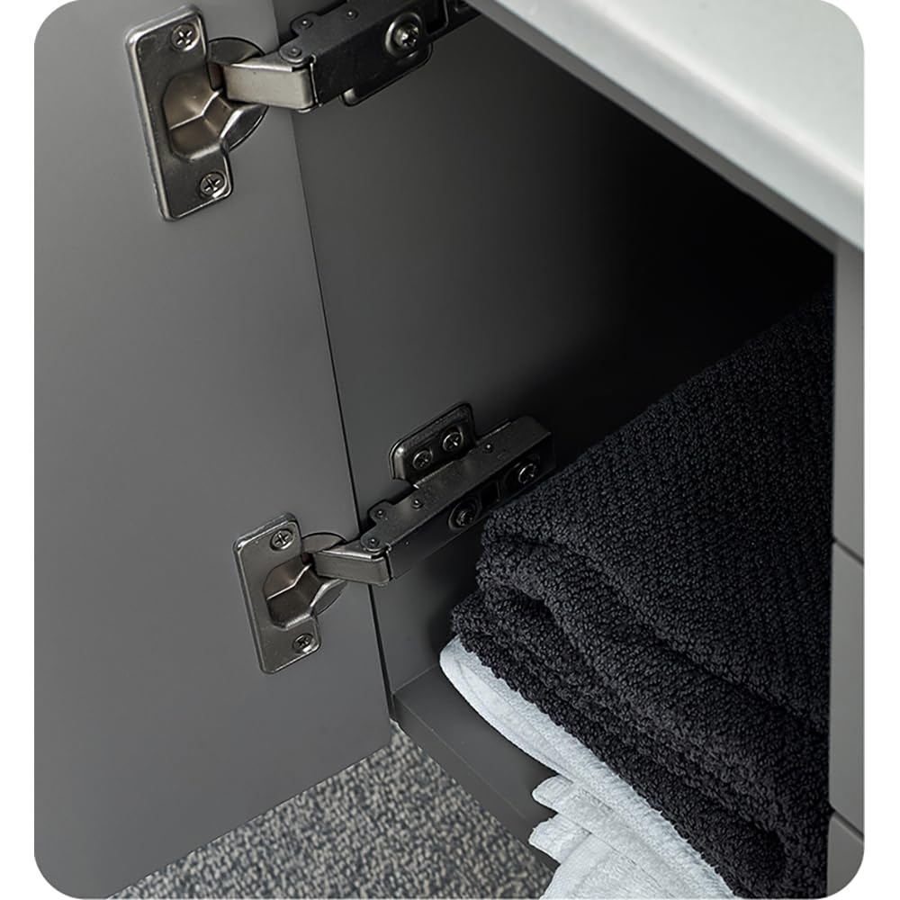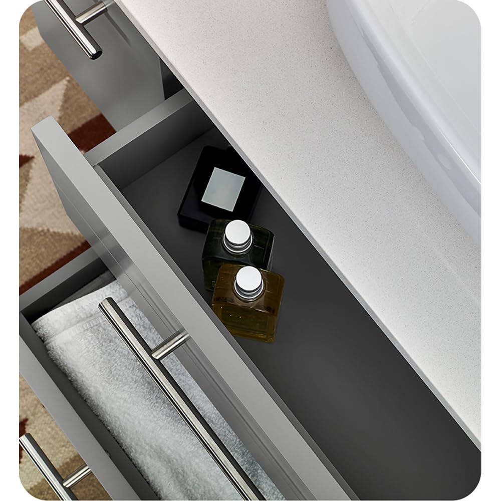 Classically simple with clean lines and a contoured undermount sink, this Fresca Lucera Wall Hung Modern Bathroom Cabinet will bring out the best in any bathroom. Measuring 36 in width, this sophisticated cabinet has a well constructed solid wood frame with a roomy right-side compartment for holding bathroom essentials and a spacious drawer with a decorative beveled drawer plate design. The door and drawer are soft-closing and feature slim brushed metal handles. This modern cabinet has a chic painted Gray finish. Gracing the top of the cabinet is a striking quartz stone countertop with backsplash and a white ceramic undermount sink. The sink is equipped with an integrated overflow and single hole faucet mount, ready for the faucet of your choice (sold separately). This cabinet includes installation hardware and is available in several sizes and finishes to meet your decorating needs.