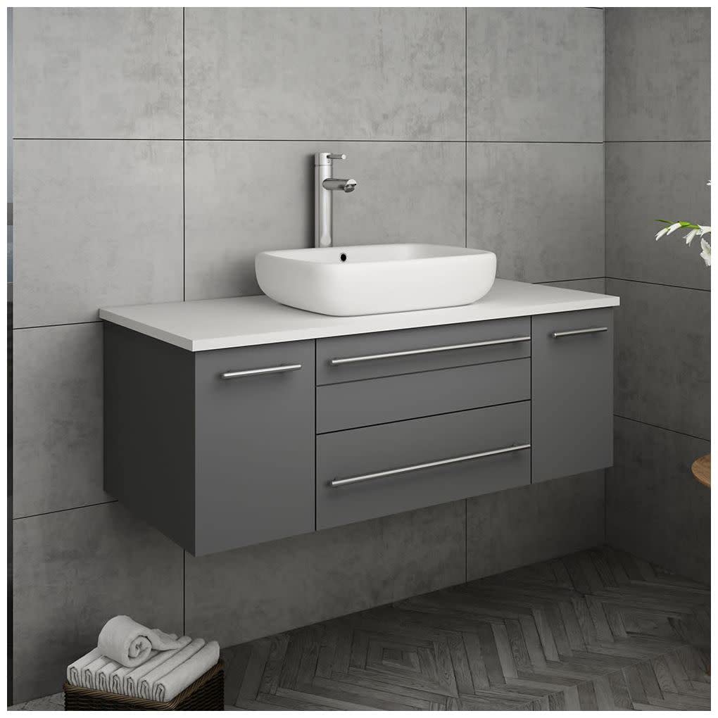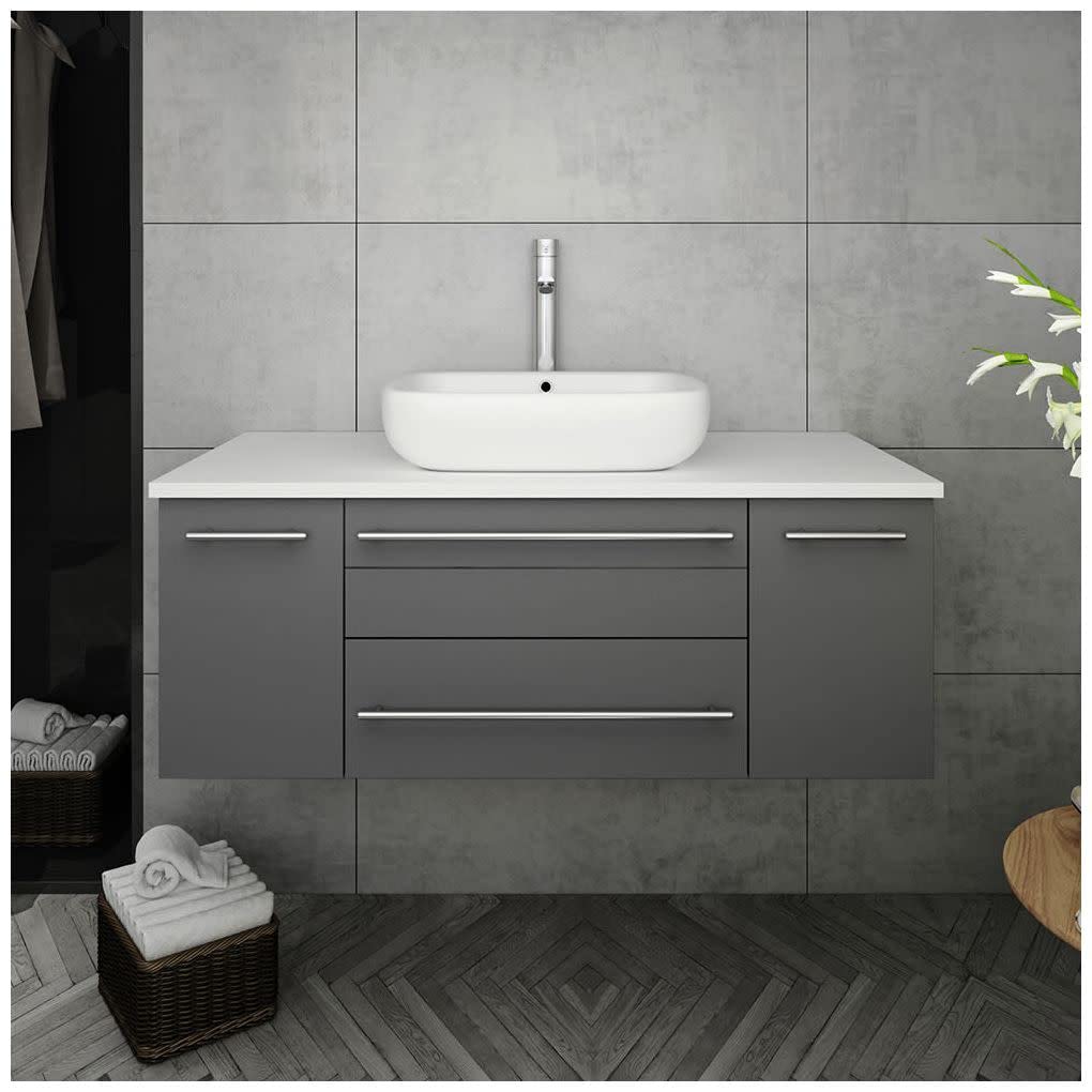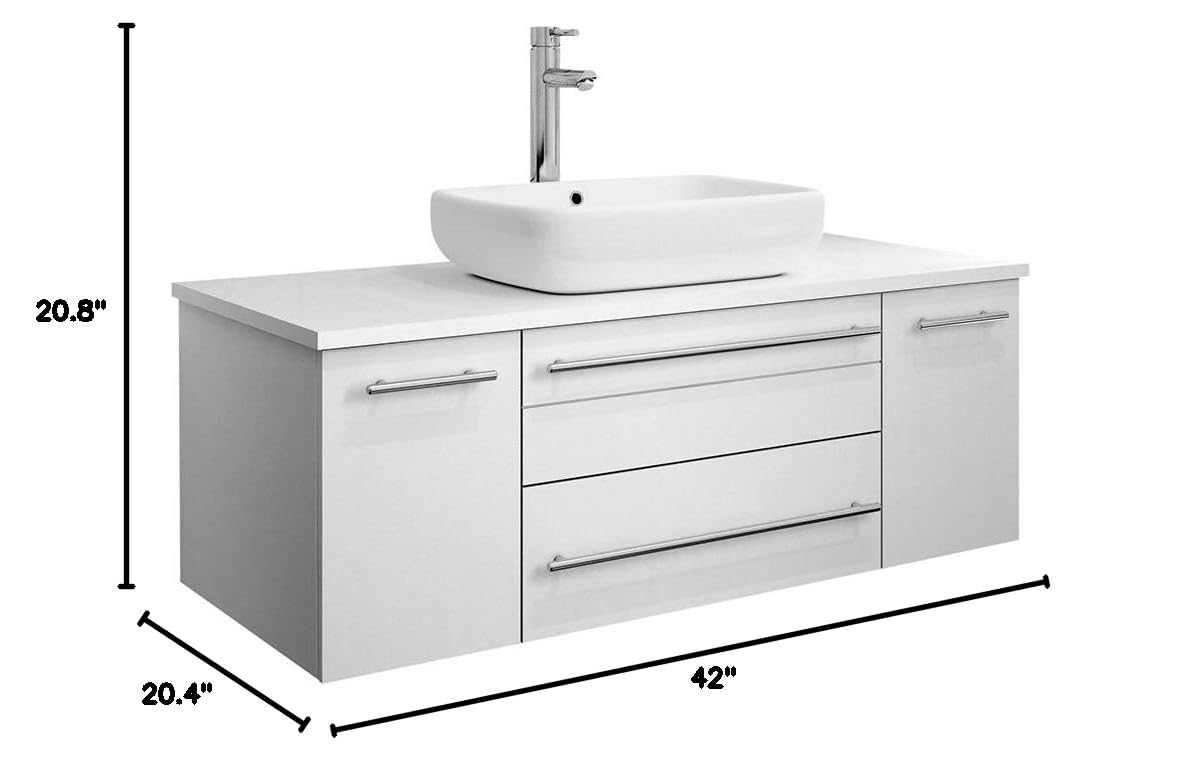 Classically simple with clean lines and a beautiful vessel sink, this Fresca Lucera wall hung modern bathroom cabinet will bring out the best in any bathroom. Measuring 42" in width, this sophisticated cabinet has a well constructed solid wood frame with two roomy storage compartments for holding bathroom essentials and two spacious drawers with a decorative beveled drawer plate design. The doors and drawers are soft-closing and feature slim brushed metal handles. Gracing the top of the cabinet is a striking quartz stone countertop with a vessel sink. The sink is equipped with an integrated overflow and single hole vessel faucet mount, ready for the faucet of your choice (sold separately). This cabinet includes installation hardware and is available in several sizes and finishes to meet your decorating needs