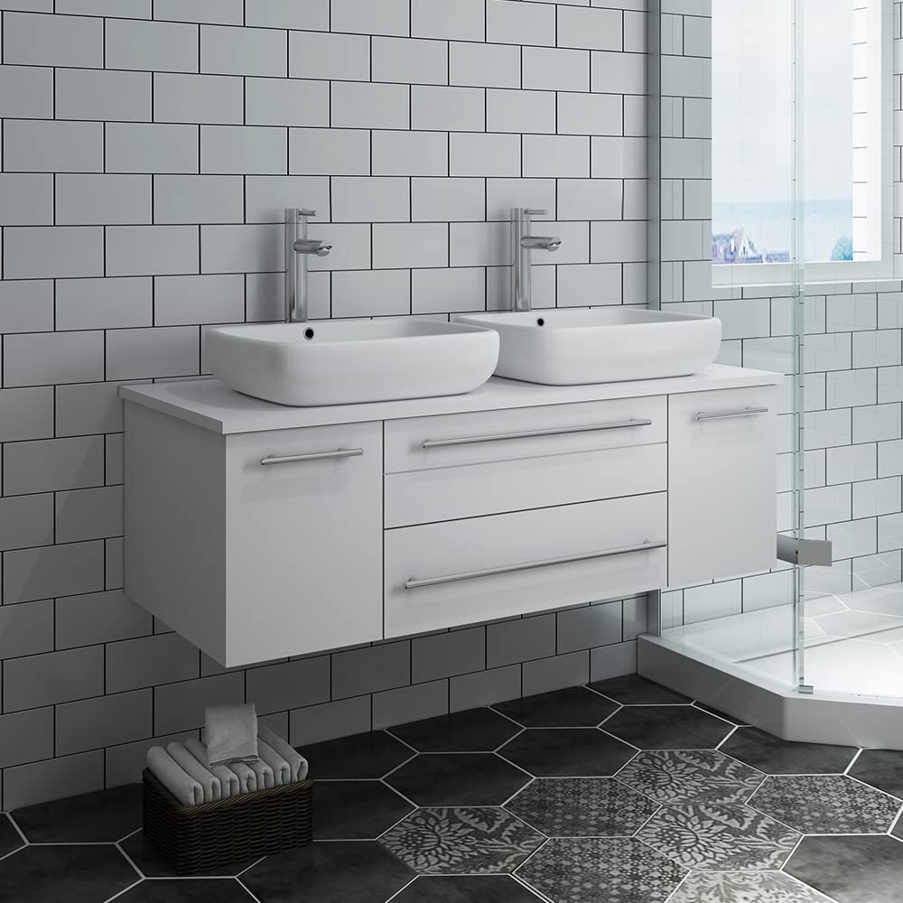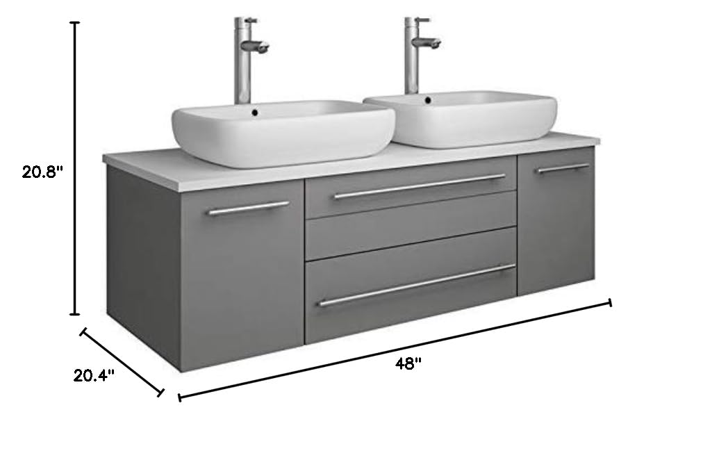 Classically simple with clean lines and two beautiful vessel sinks, this Fresca Lucera Wall Hung Modern Bathroom Cabinet will bring out the best in any bathroom. Measuring 48" in width, this sophisticated cabinet has a well constructed solid wood frame with two roomy storage compartments for holding bathroom essentials and two spacious drawers with a decorative beveled drawer plate design. The doors and drawers are soft-closing and feature slim brushed metal handles. This modern cabinet has a chic painted Gray finish. Gracing the top of the cabinet is a striking quartz stone countertop with two white vessel sinks. Each sink is equipped with an integrated overflow and single hole vessel faucet mount, ready for the faucets of your choice (sold separately). This cabinet includes installation hardware and is available in several sizes and finishes to meet your decorating needs.