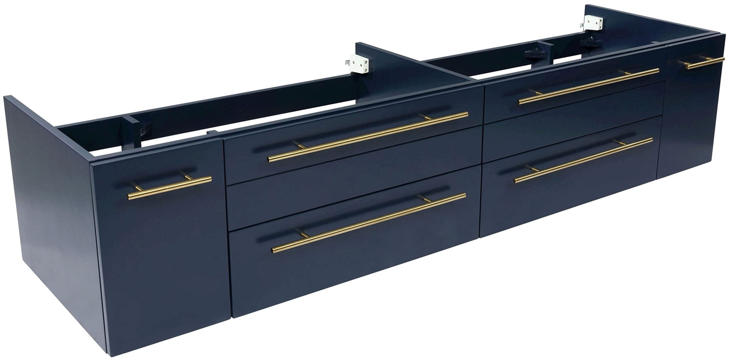 Classically simple with clean lines and an elegant look, this Fresca Lucera Wall Hung Modern Bathroom Cabinet will bring out the best in any bathroom. Measuring 72 in width, this sophisticated cabinet has a well constructed solid wood frame with two roomy storage compartments for holding bathroom essentials and two spacious drawers with a decorative beveled drawer plate design. The doors and drawers are soft-closing and feature slim brushed metal handles. This modern cabinet has a chic painted Royal Blue finish. It includes installation hardware and is available in several sizes and finishes to meet your decorating needs.