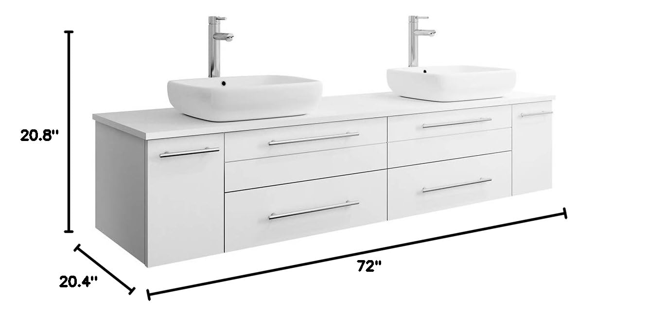Classically simple with clean lines and two beautiful vessel sinks, this Fresca Lucera Wall Hung Modern Bathroom Cabinet will bring out the best in any bathroom. Measuring 72" in width, this sophisticated cabinet has a well constructed solid wood frame with two roomy storage compartments for holding bathroom essentials and four spacious drawers with a decorative beveled drawer plate design. The doors and drawers are soft-closing and feature slim brushed metal handles. This modern wall hung cabinet has a chic painted White finish. Gracing the top of the cabinet is a striking quartz stone countertop with two white vessel sinks. Each sink is equipped with an integrated overflow and single hole vessel faucet mount, ready for the faucets of your choice (sold separately). This cabinet includes installation hardware and is available in several sizes and finishes to meet your decorating needs.
