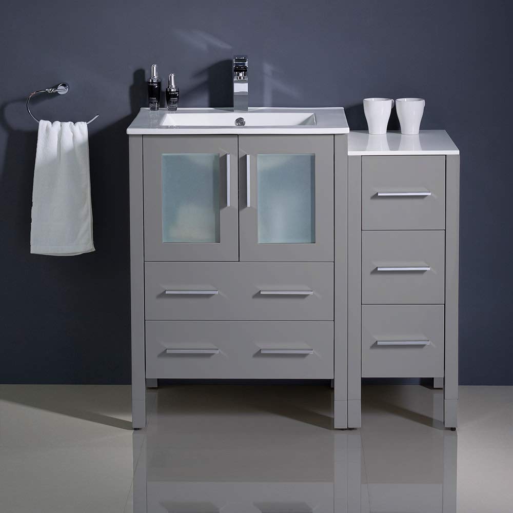 - Materials: Engineered Wood, Ceramic Sink with Overflow, Glass/Stone Composite Countertop (12" Cabinet)