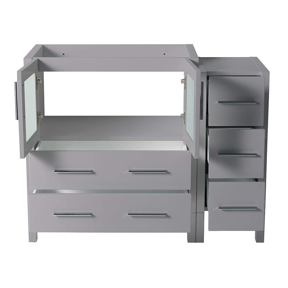 Add a fresh, contemporary touch to your bathroom with this elegant cabinet combination in a rich Espresso finish. With soft close drawers and chic doors with frosted glass panels, this distinctive bathroom cabinet configuration really catches the eye. The doors open to reveal great under-the-sink storage space while the sleek side unit features handy drawers that are ideal for keeping daily needs within reach. The polished chrome pulls are included, adding the perfect finishing touch. Available in the rich finishes of Espresso, Gray Oak, Light Oak or White, the Fresca Torino Modern Bathroom Cabinets are designed to add elegance to any décor. These cabinets measure 42 in width and are available in varies sizes and configurations.