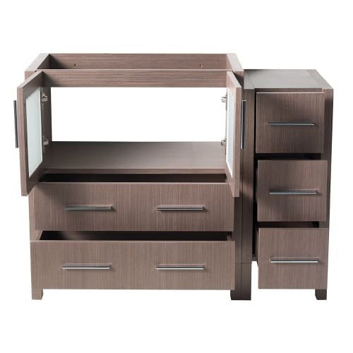 Add a fresh, contemporary touch to your bathroom with this elegant cabinet combination in a clean White finish. With soft close drawers and chic doors with frosted glass panels, this distinctive bathroom cabinet configuration really catches the eye. The doors open to reveal great under-the-sink storage space while the sleek side unit features handy drawers that are perfect for keeping daily needs within reach. The polished chrome pulls are included, adding the perfect finishing touch. Available in the rich finishes of Espresso, Gray Oak, Light Oak or White, the Fresca Torino Modern Bathroom Cabinets are designed to add elegance to any décor. These cabinets measure 42 in width and are available in varies sizes and configurations.