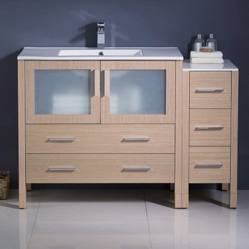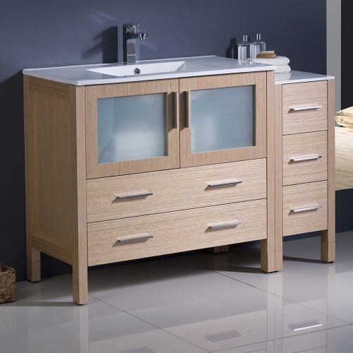 Add a fresh, contemporary touch to your bathroom with this elegant cabinet combination in a rich Espresso finish. With soft close drawers, chic doors with frosted glass panels, and integrated matching sinks this distinctive bathroom cabinet configuration really catches the eye. The doors open to reveal great under-the-sink storage space while the sleek side unit features handy drawers that are ideal for keeping daily needs within reach. The polished chrome pulls are included, adding the perfect finishing touch. These cabinets are available in multiple rich finishes and are available in varies sizes and configurations to add elegance to any décor.
