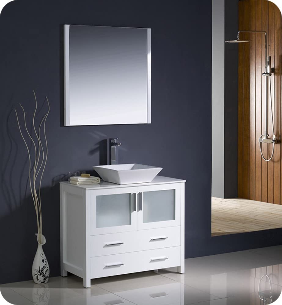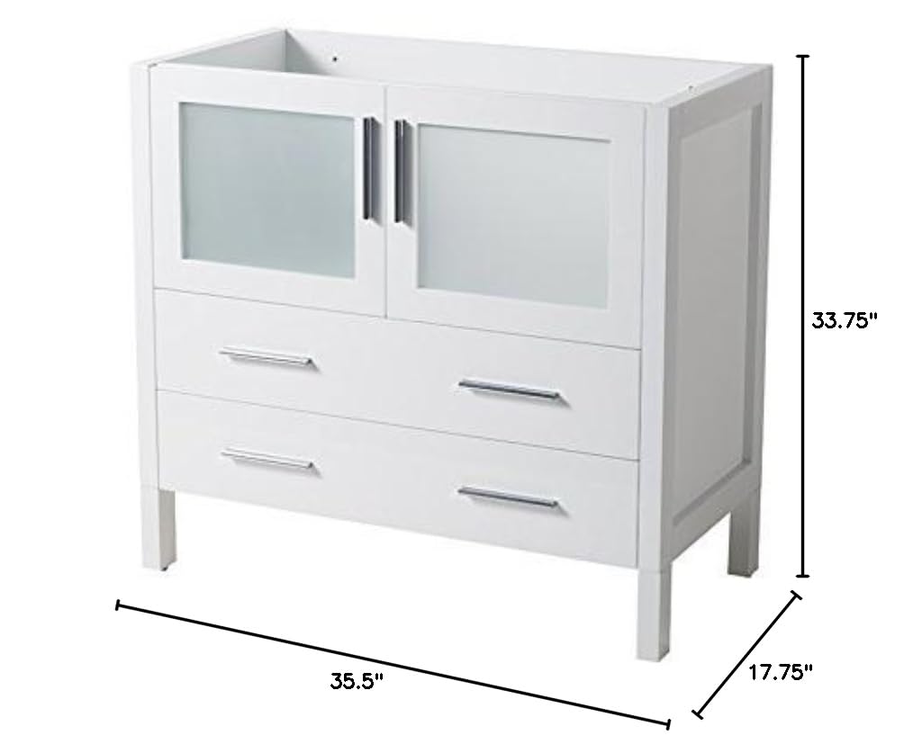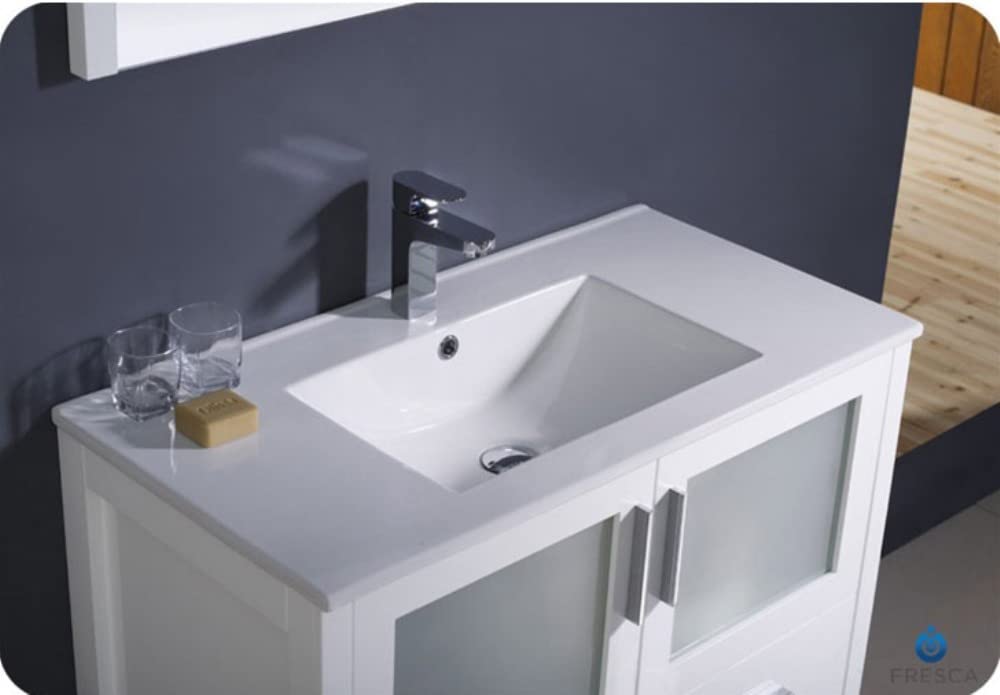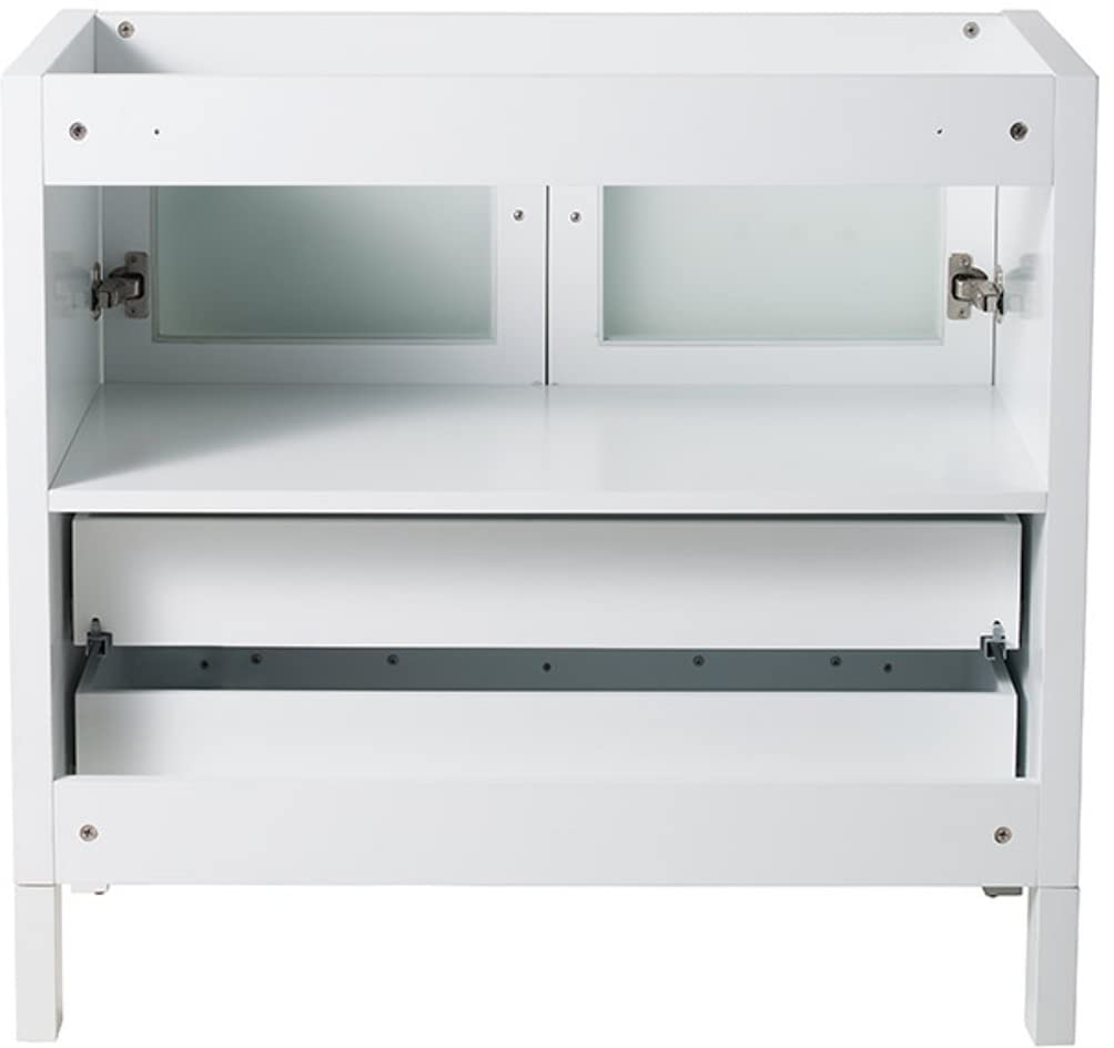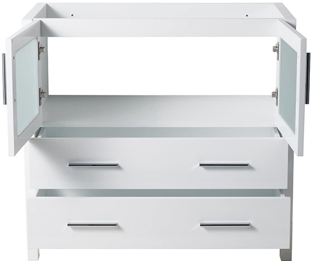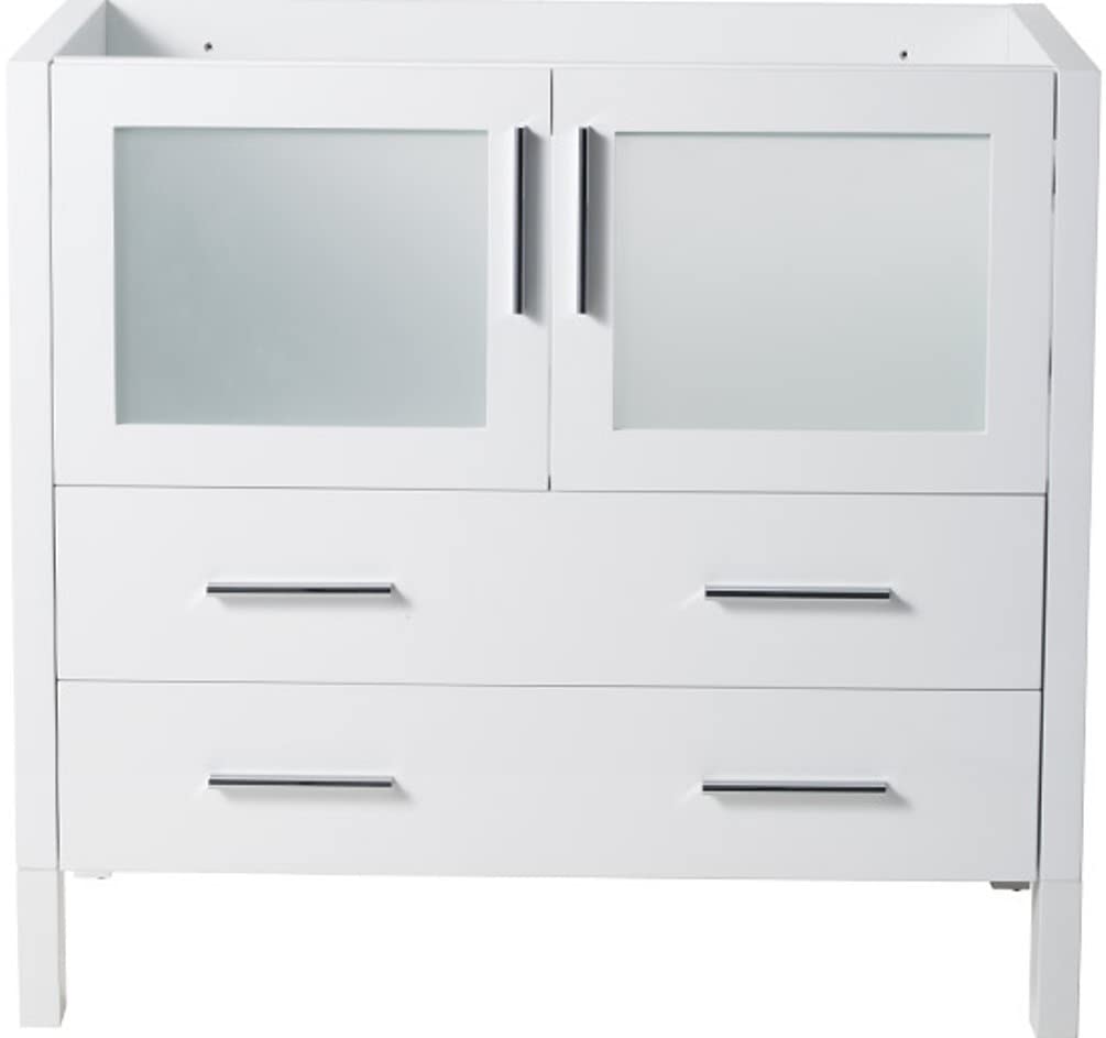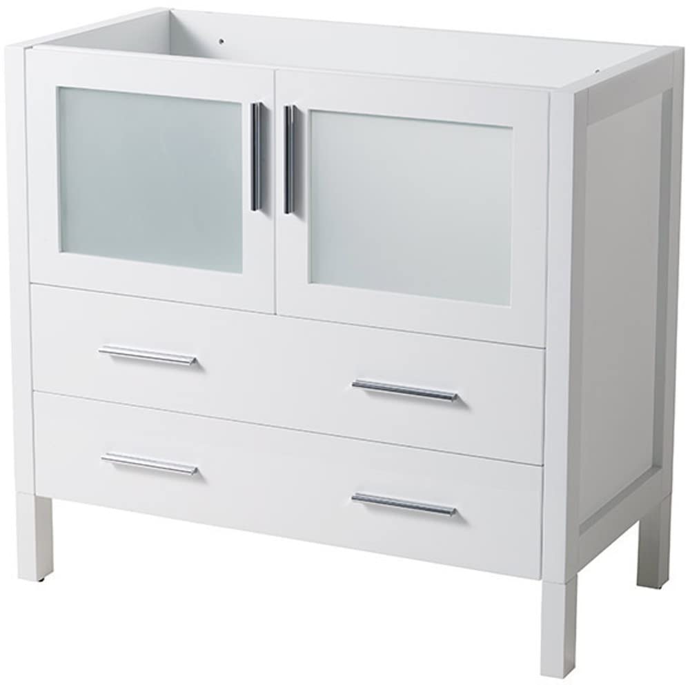 Add a fresh, contemporary touch to your bathroom with this elegant cabinet in a clean White finish. With two soft close drawers and chic doors with frosted glass panels, this stylish bathroom cabinet features clean lines and a smart design. The doors open to reveal great under-the-sink storage space while the drawers are a generous size for holding bathroom essentials. The polished chrome pulls are included, adding the perfect finishing touch. Available in the rich finishes of Espresso, Gray Oak, Light Oak or White, the Fresca Torino Modern Bathroom Cabinet adds elegance to any décor. This particular cabinet is designed to accommodate a counter top that measures 36 in width. It is also available in sizes that can accommodate counter tops measuring 24 and 30.