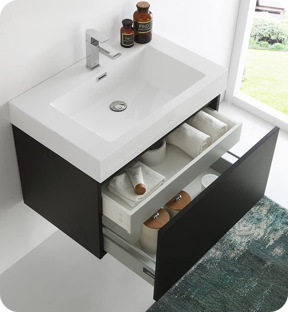 The Fresca Mezzo line features a square wall-mounted floating Black cabinet with spacious soft closing drawer and a fabulous nested drawer storage system inside. This lovely cabinet is available in multiple sizes to give any bathroom a bright, modern look and feel.