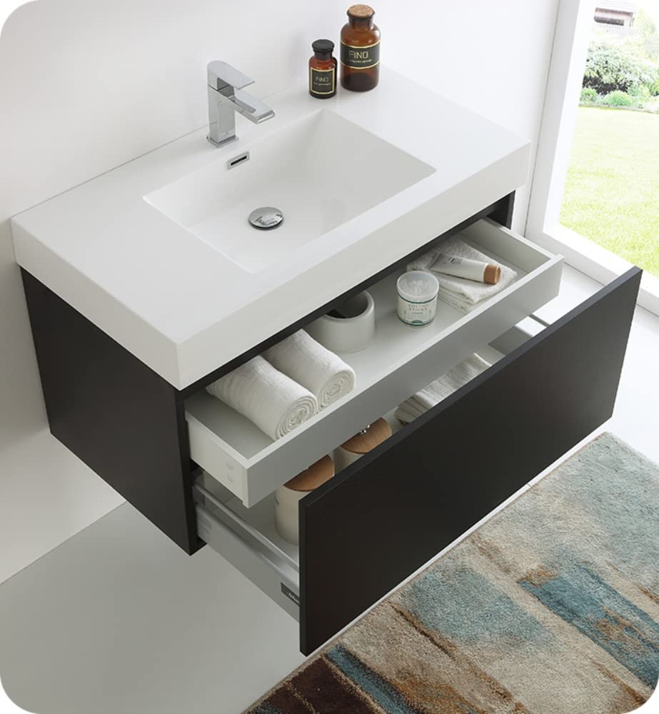 The Fresca Mezzo line features a square wall-mounted floating Black cabinet with spacious soft closing drawer and a fabulous nested drawer storage system inside. This lovely cabinet is available in multiple sizes to give any bathroom a bright, modern look and feel.