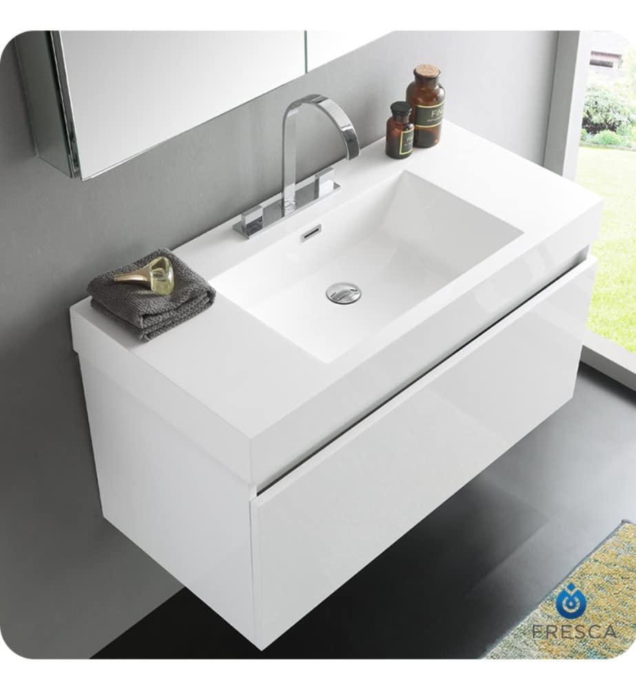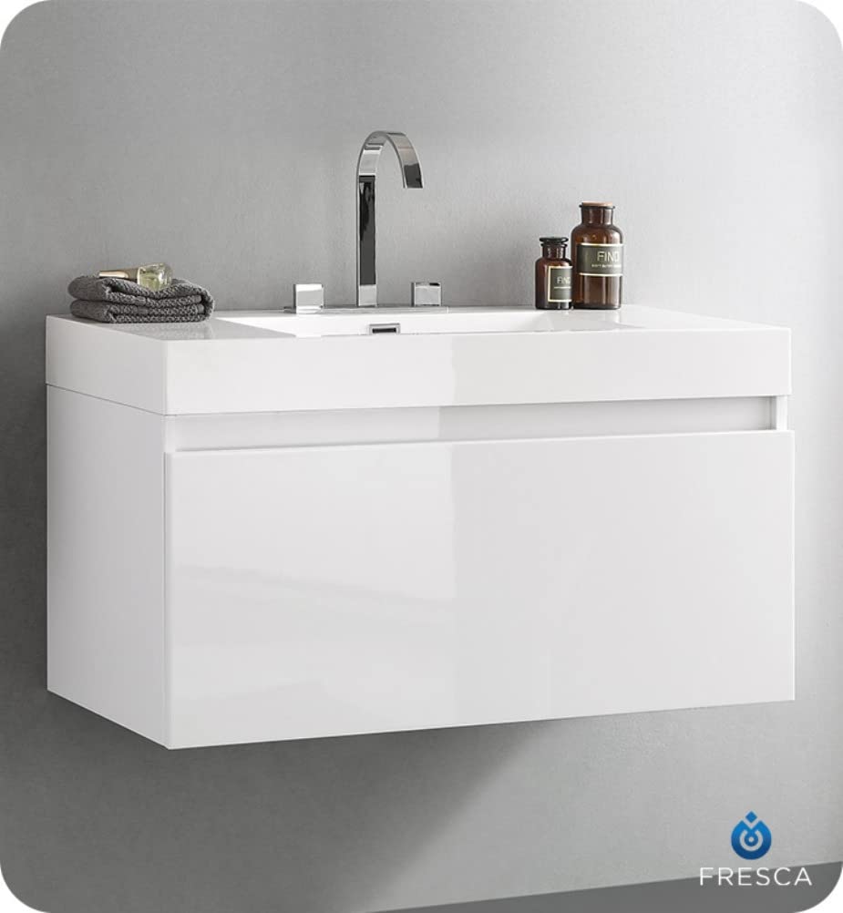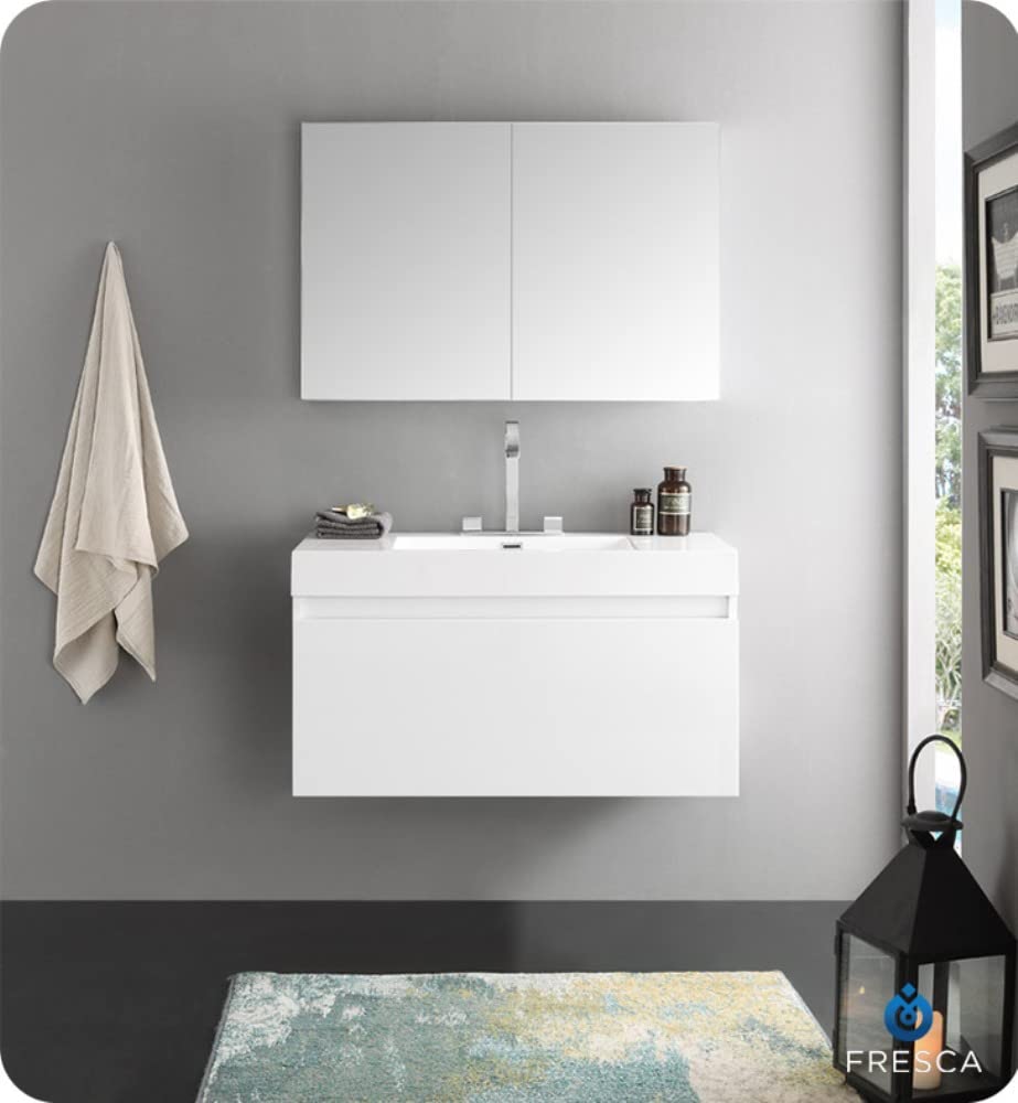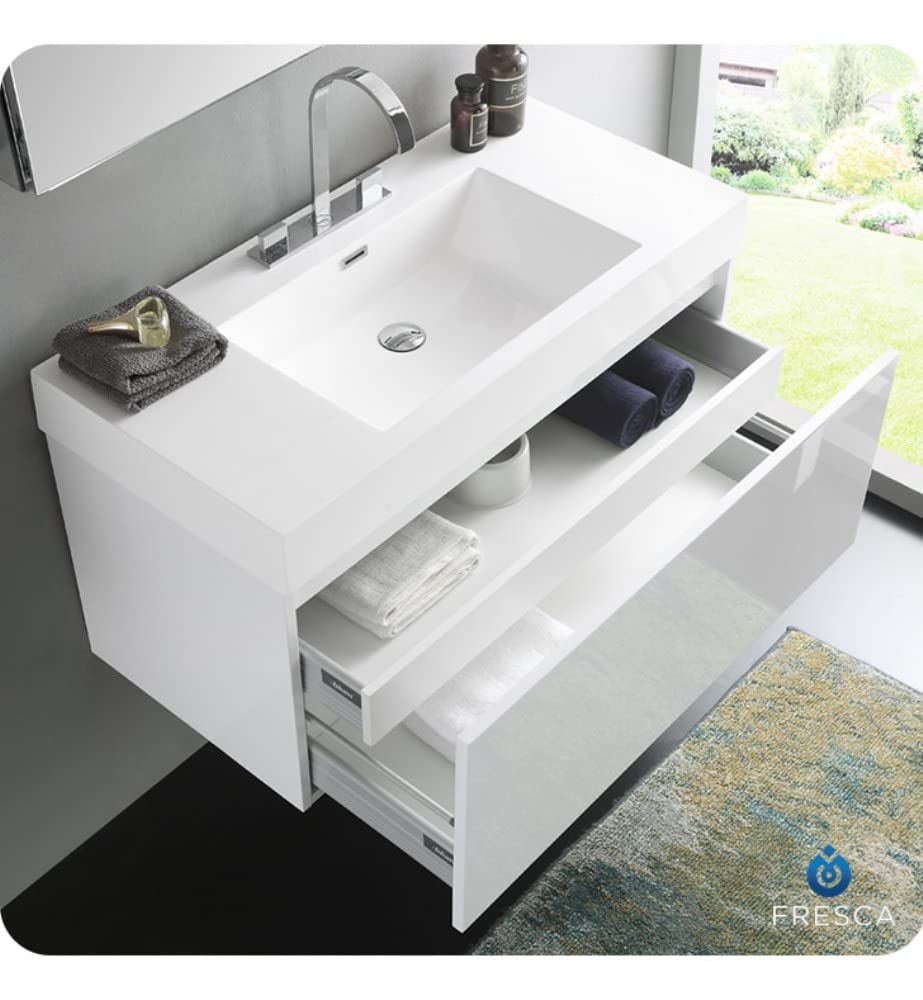The wall mounted Fresca Mezzo Modern Bathroom Cabinet is stylish and contemporary. It features a spacious, soft closing drawer with an innovative, nested drawer storage system inside. This rectangular floating cabinet measures 39” in width. With its Glossy White finish, it would blend beautifully with any décor scheme. The Fresca Mezzo Modern Bathroom Cabinet is also available with a Black, Gray Oak or Teak finish.