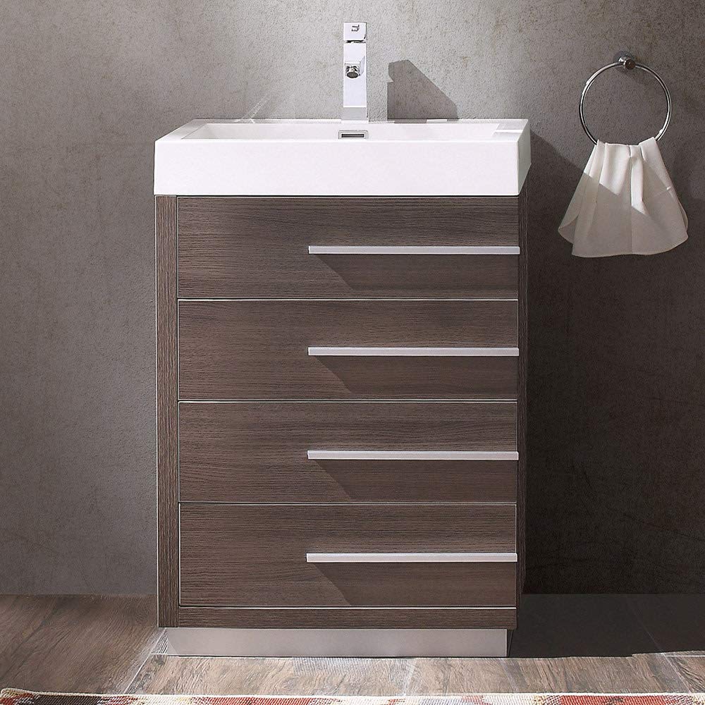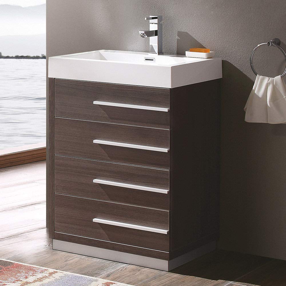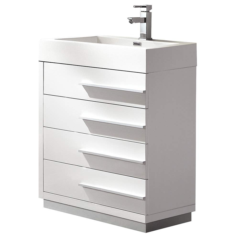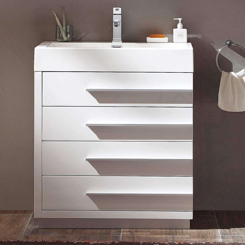 With clean lines and trendy offset brushed pulls, this stylish bathroom cabinet with a tall profile sink adds a touch of design elegance to any home. With four spacious soft closing drawers, the sleek Fresca Livello cabinet instantly updates tired décor. The fresh Glossy White finish will transform your bathroom into your own personal oasis.This Fresca Livello Modern Bathroom Cabinet is available in two sizes: 24 inch width and a larger 30 inch width. It is available in the elegant finishes of Black, Gray Oak, Walnut, Teak and Glossy White.