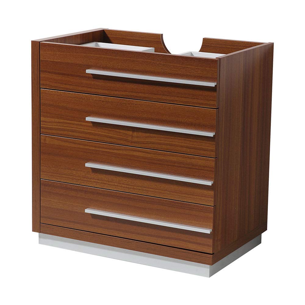 With clean lines and trendy offset brushed pulls, this stylish bathroom cabinet adds a touch of design elegance to any home. With four spacious soft closing drawers, the sleek Fresca Livello cabinet instantly updates tired décor. With a rich Teak finish, this cabinet is a must-have for a modern or traditional bathroom. This Fresca Livello Modern Bathroom Cabinet measures 30 in width and also comes in a 24 width. It is available in the elegant finishes of Black, Gray Oak, Walnut, Teak and Glossy White.