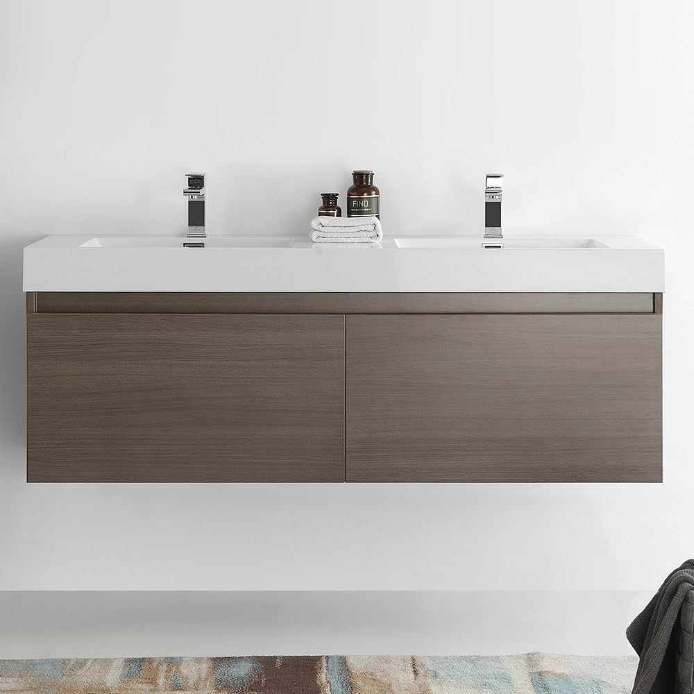 The Fresca Mezzo line features a stunning white double sink with a contemporary waved bottom, smooth lines and a thick profile. The White rectangular wall mounted floating bathroom vanity provides plenty of storage to keep bathroom essentials organized. Two soft closing drawers open to reveal a fabulous nested drawer storage system inside, creating a total of four compartments. This lovely vanity is available in multiple sizes to give a chic, modern touch to any bathroom.