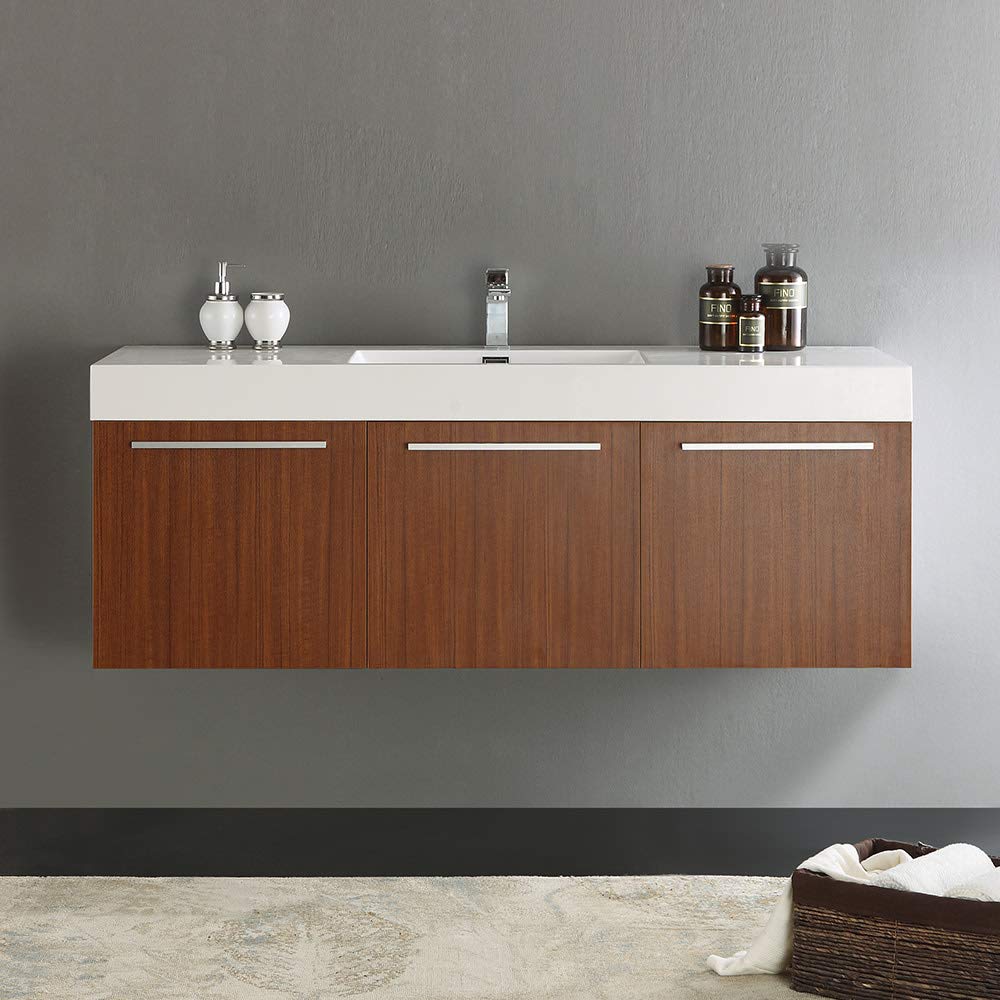 Take your bathroom from basic to beautiful with the Fresca Vista line. The trendy white rectangular sink has smooth lines and a thick profile, while the White wall mounted vanity offers superior storage. Three soft close doors feature sleek brushed pulls. This lovely vanity is available in multiple sizes to give a chic, modern touch to any bathroom.