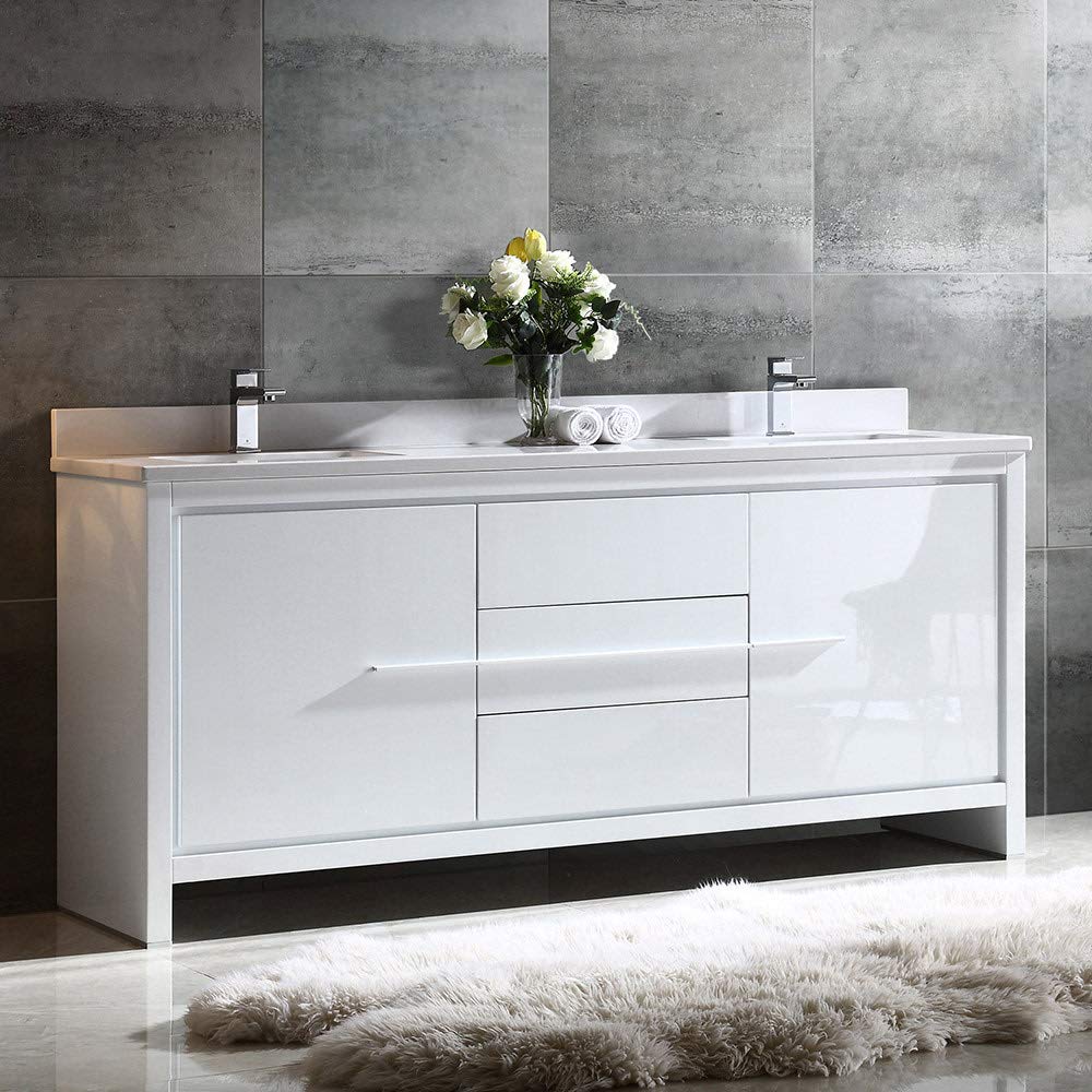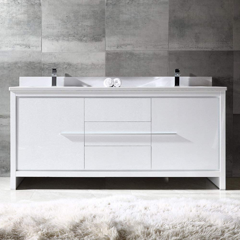 This contemporary double sink bathroom cabinet is a unique combination of casual function and elegant form. Designed to complement any decor scheme, the Fresca Allier Modern Double Sink Bathroom Cabinet features a one piece countertop with two undermount sinks, soft closing doors and handy drawers to hold all of your bathroom essentials. With clean lines and three trendy brushed pulls that align to create the illusion of one single handle, this rectangular cabinet has a fresh White finish that blends beautifully with any space. Measuring 72" in width, this cabinet is the perfect fit for todays modern bathroom and is available in multiple sizes and finishes.