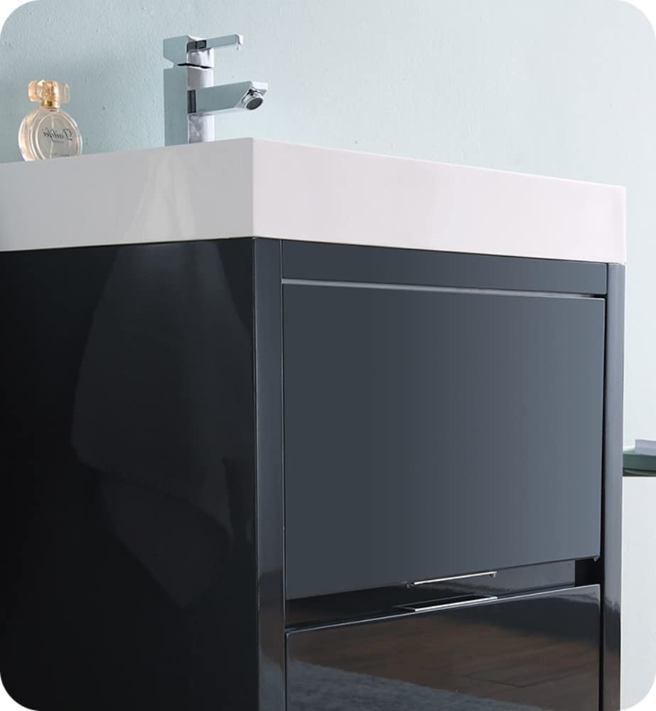 The Fresca Valencia Free Standing Modern Bathroom Cabinet is the ideal starting point for creating an elegant and modern bathroom. The rectangular vanity offers great storage with two soft-closing drawers, just perfect for organizing all of your daily essentials. The drawers feature concealed aluminum handles and the cabinet has a stylish Glossy Dark Slate Gray finish. It rests on a silver base, adding to its modern look. This cabinet is available in multiple sizes and makes a stylish statement in any home.