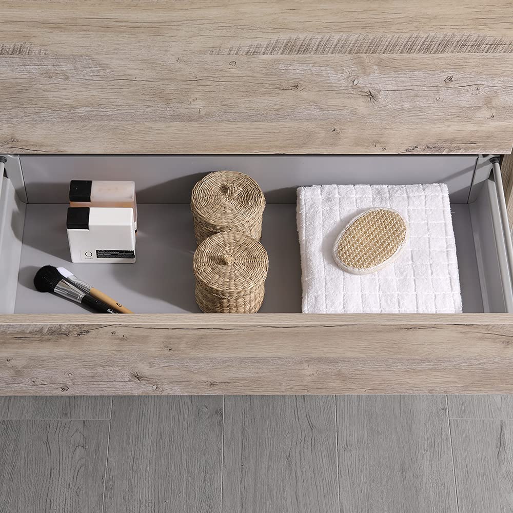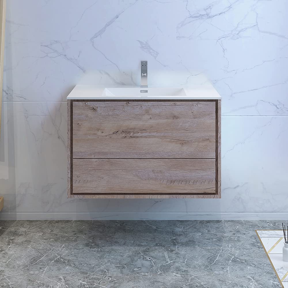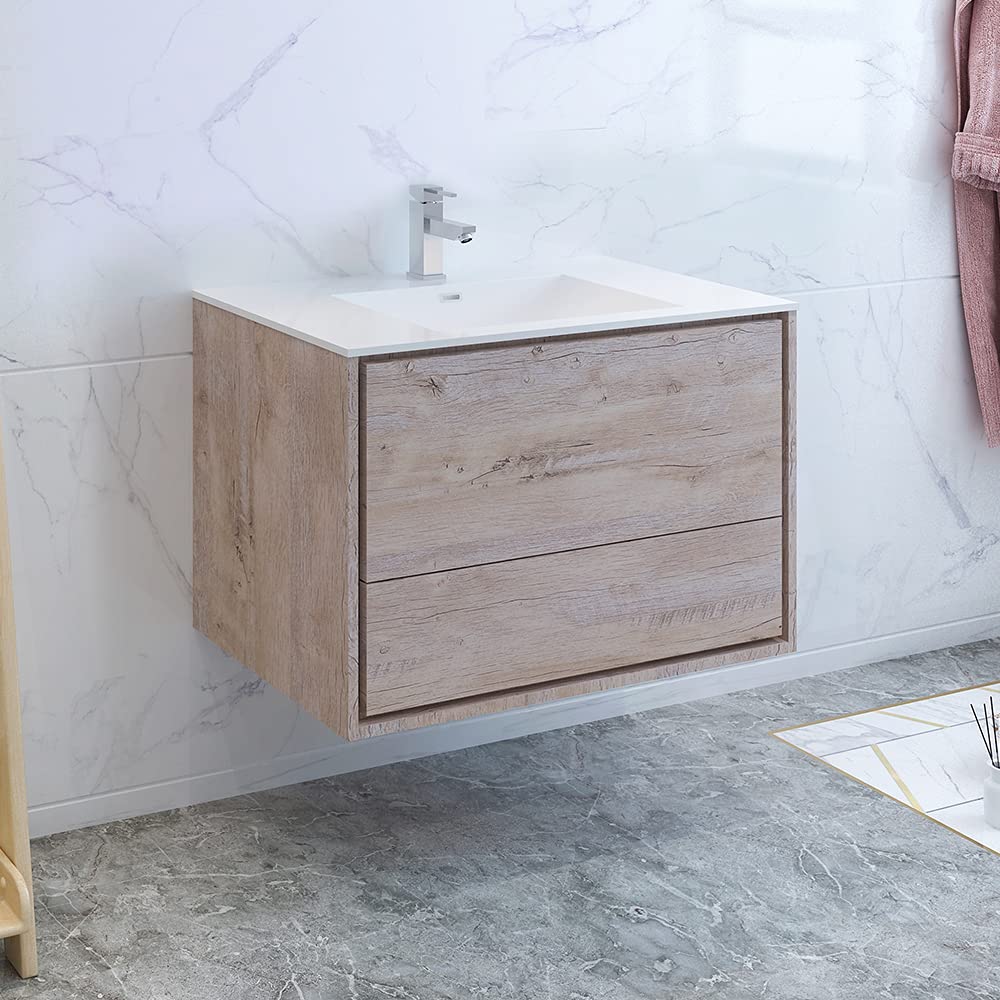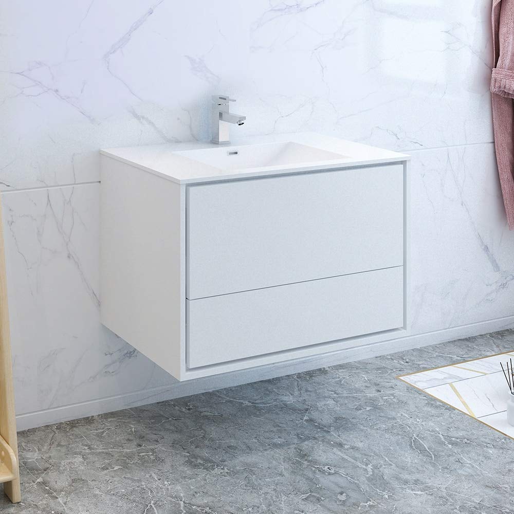 With its stylish White finish, the Fresca Catania Wall Hung Modern Bathroom Cabinet with Integrated Sink adds a contemporary touch to any bathroom. Two spacious soft-closing metal frame drawers offer sensational storage space, perfect for keeping all of your daily essentials out of sight but within reach. The drawers feature push-release hardware, offering a streamlined front that beautifully complements the minimalist look. Gracing the top of the cabinet is an eye-catching white acrylic-resin countertop/sink with smooth edges and integrated overflow. The sink is designed for durability and style and has been pre-drilled to accommodate a single hole faucet (sold separately). This chic cabinet is available in multiple sizes and finishes. To make installation a breeze, it comes fully assembled and includes installation hardware.