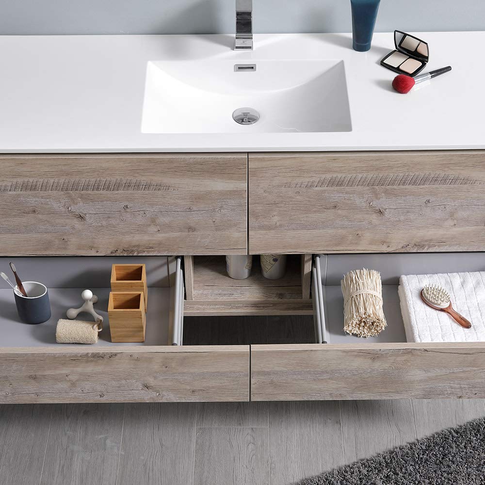 With its stylish Rustic Natural Wood finish, the Fresca Catania Wall Hung Modern Bathroom Cabinet with Integrated Single Sink adds a contemporary touch to any bathroom. Four spacious soft-closing metal frame drawers offer sensational storage space for todays modern family. The drawers feature push-release hardware, offering a streamlined front that beautifully complements the minimalist look. Gracing the top of the cabinet is an eye-catching white acrylic-resin countertop/sink with smooth edges and integrated overflow. The sink is designed for durability and style and has been pre-drilled to accommodate a single hole faucet (sold separately). The large counter space is ideal for displaying hand towels or keeping morning and evening necessities close at hand. This lovely cabinet is available in multiple sizes and finishes. To make installation a breeze, it comes fully assembled and includes installation hardware.