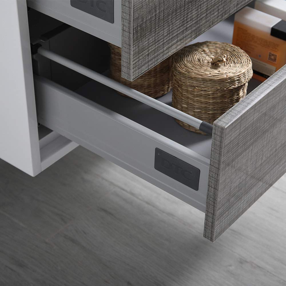 - 4 soft closing metal frame vanity drawers with DTC rail system