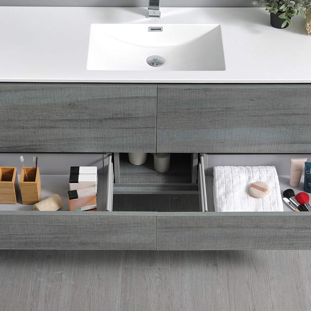 With its stylish White finish, the Fresca Catania Wall Hung Modern Bathroom Cabinet with Integrated Single Sink adds a contemporary touch to any bathroom. Four spacious soft-closing metal frame drawers offer sensational storage space for todays modern family. The drawers feature push-release hardware, offering a streamlined front that beautifully complements the minimalist look. Gracing the top of the cabinet is an eye-catching white acrylic-resin countertop/sink with smooth edges and integrated overflow. The sink is designed for durability and style and has been pre-drilled to accommodate a single hole faucet (sold separately). The large counter space is ideal for displaying hand towels or keeping morning and evening necessities close at hand. This lovely cabinet is available in multiple sizes and finishes. To make installation a breeze, it comes fully assembled and includes installation hardware.