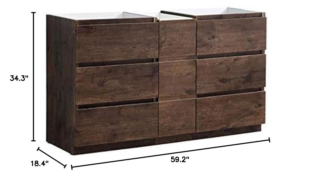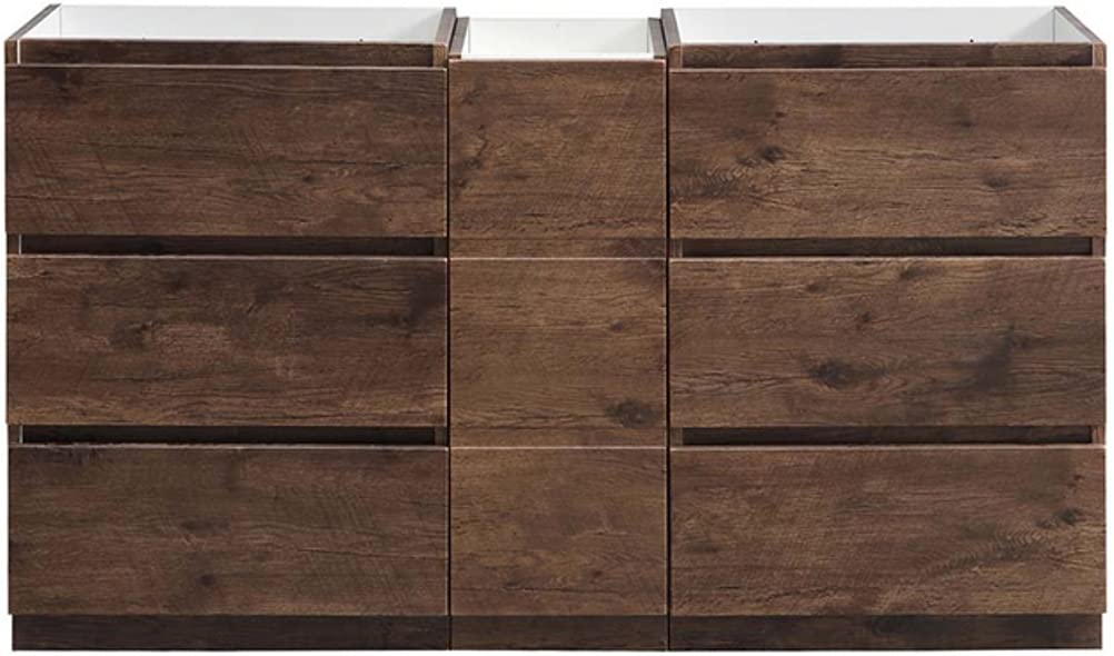 With its chic Rosewood finish, the Fresca Lazzaro Free Standing Modern Double Sink Bathroom Cabinet is the ideal combination of style and function. It features a center cabinet with two roomy compartments and six spacious soft-closing wood drawers, ideal for storing and organizing all of your daily essentials. The door and drawers feature push-release hardware, creating a streamlined front that beautifully complements the minimalist design. This modern cabinet will enhance any décor and is available in multiple sizes and finishes. It includes installation hardware.