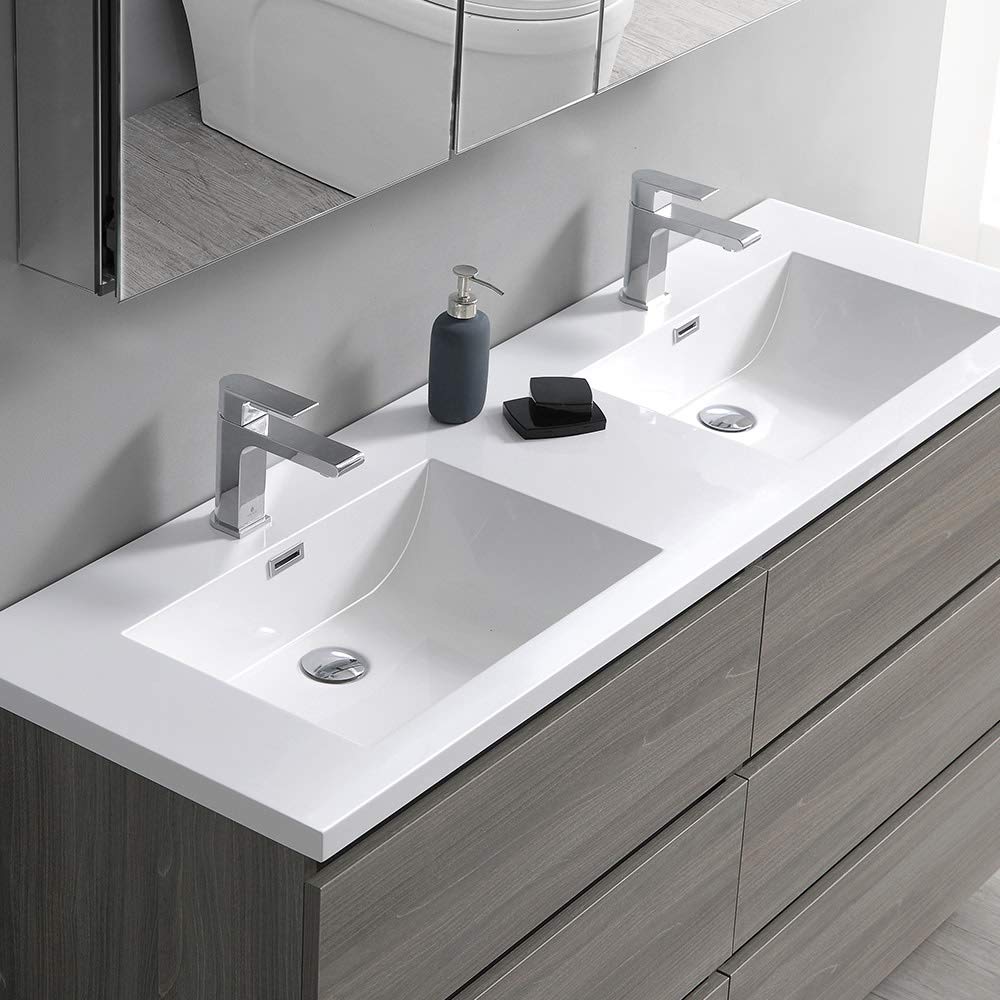 With its chic Rosewood finish, the Fresca Lazzaro Freestanding Modern Bathroom Cabinet with Integrated Double Sink is the ideal combination of style and function. Six spacious soft-closing wood drawers offer wonderful storage space, perfect for keeping all of your daily essentials out of sight and the family organized. The drawers feature push-release hardware, offering a streamlined front that beautifully complements the minimalist design. Gracing the top of the cabinet is an eye-catching white acrylic-resin countertop/double sink with smooth edges and integrated overflow. The sinks have been pre-drilled to accommodate single hole faucets (sold separately). This modern cabinet with integrated double sink will enhance any décor and is available in multiple sizes and finishes. It includes installation hardware.