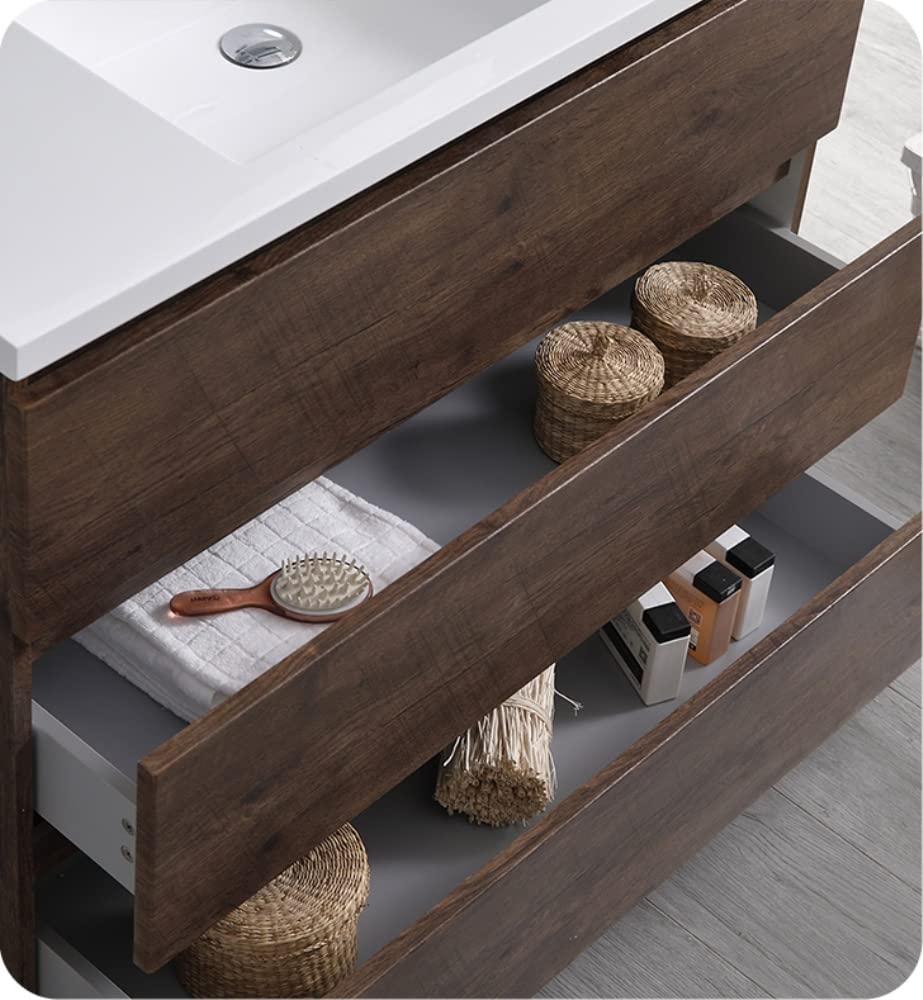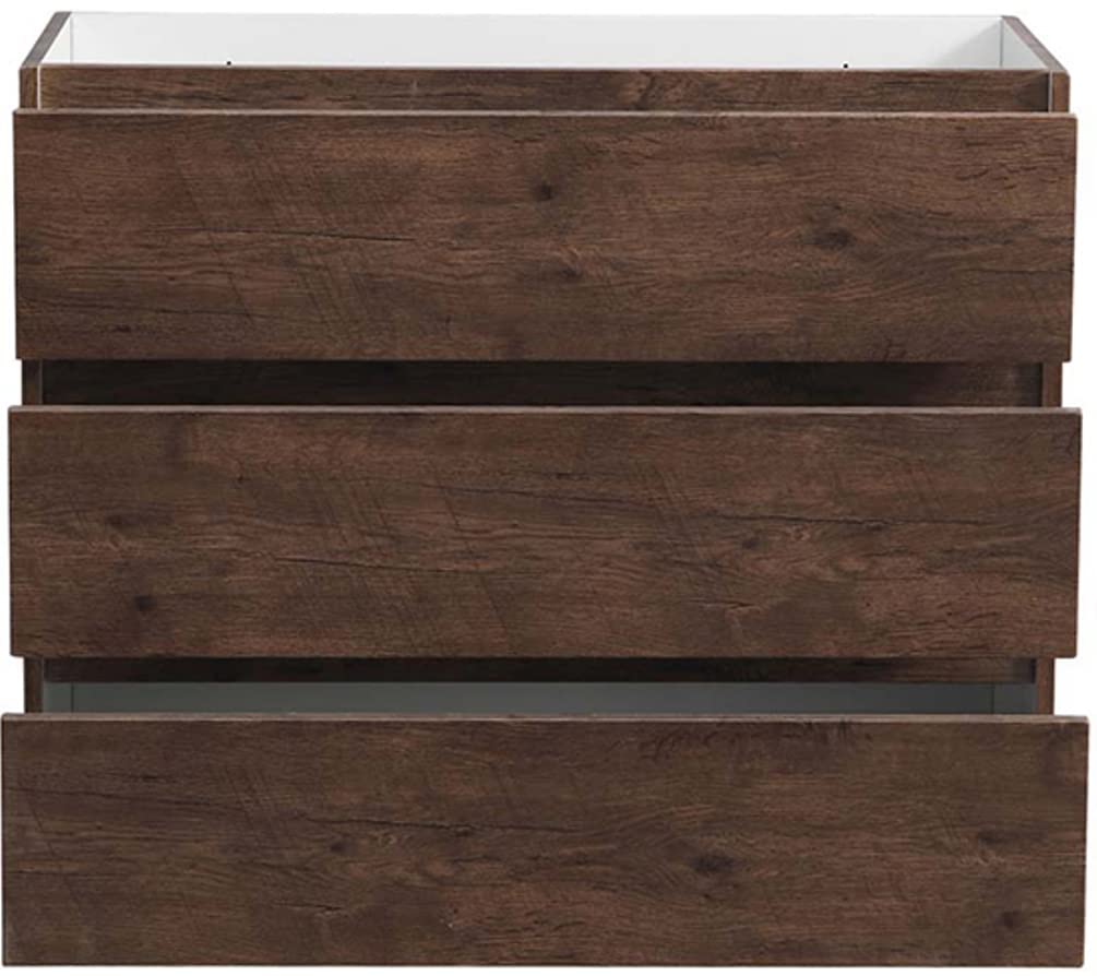 With its chic Rosewood finish, the Fresca Lazzaro Freestanding Modern Bathroom Cabinet is the ideal combination of style and function. Spacious soft-closing wood drawers can hold all of your bathroom essentials, while a roomy under-the-sink compartment provides additional space for tucking away towels or storage baskets. The drawers and doors feature push-release hardware, offering a streamlined front that beautifully complements the minimalist design. This modern cabinet will enhance any décor and is available in multiple sizes and finishes. It includes installation hardware.