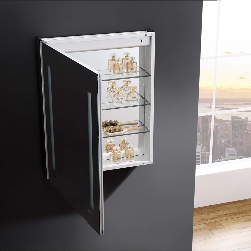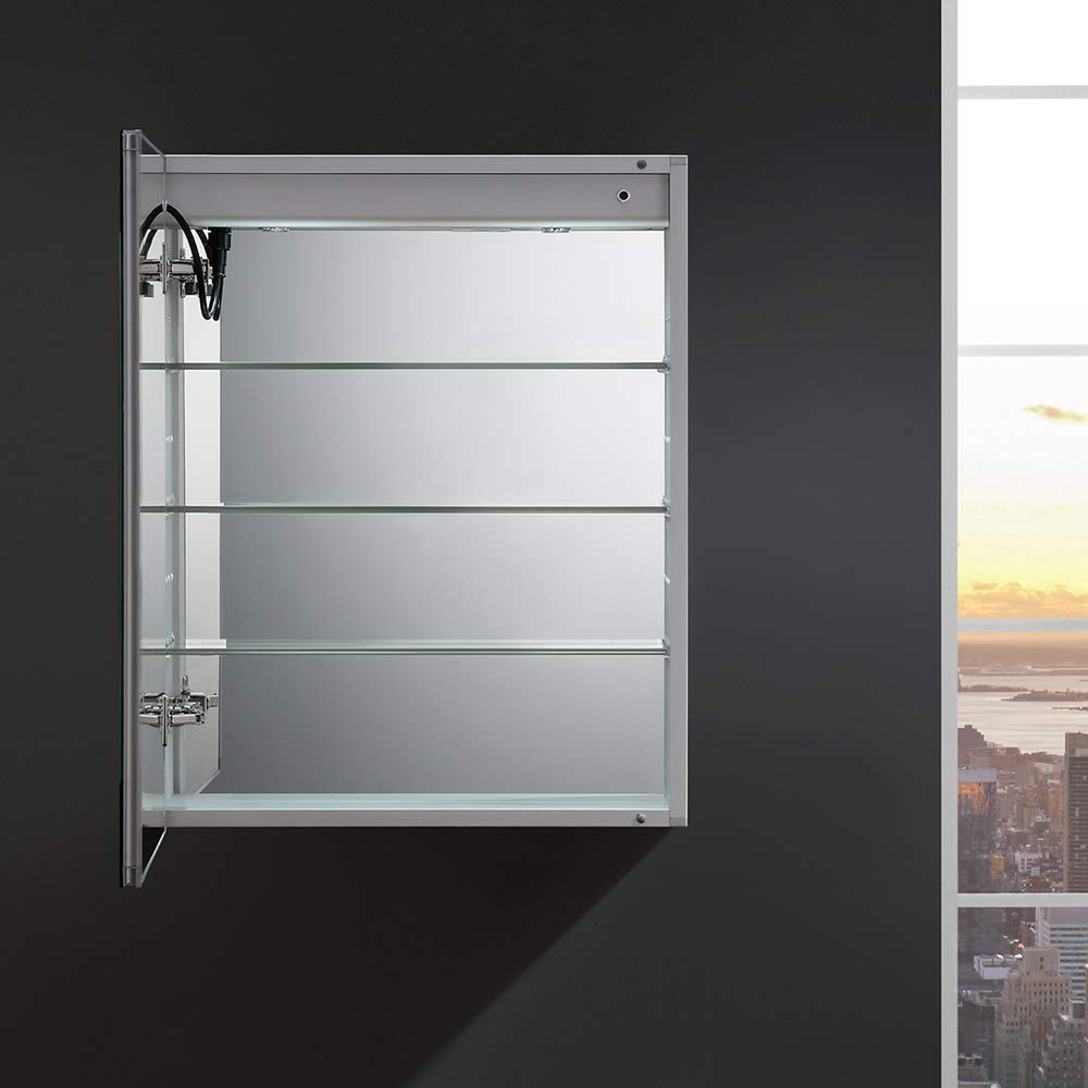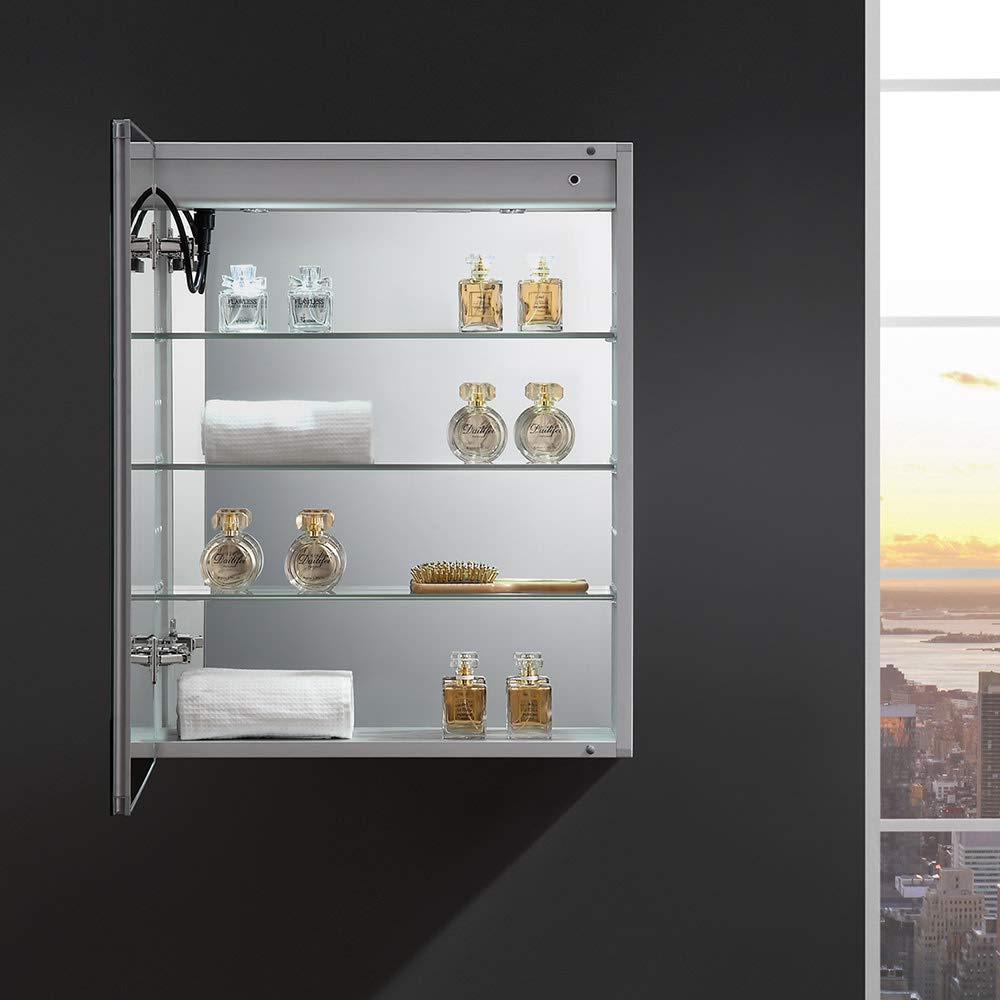 The Fresca Bathroom Medicine Cabinet comes with everything you need to create an elegant and modern bathroom, with every convenience right in front of you. On the outside, its a sophisticated frameless mirrored medicine cabinet with a built-in dimmable surface LED task light and a defogger feature. Inside, theres an LED light and a handy electrical/USB outlet combo for an electric shaver, toothbrush or other essentials. The interior features three adjustable glass shelves and a mirrored back wall. The double-sided mirrored door swings left on BLUM hinges offering a 170 degree swing. In addition to all of these great features, this particular style is equipped with a digital clock option. Measuring 24"W x 30"H x 5"D, this medicine cabinet is available in several sizes.