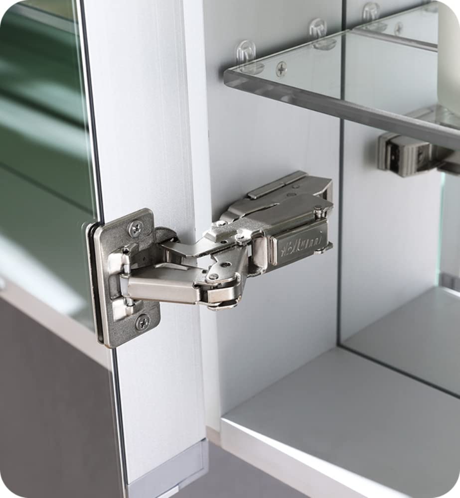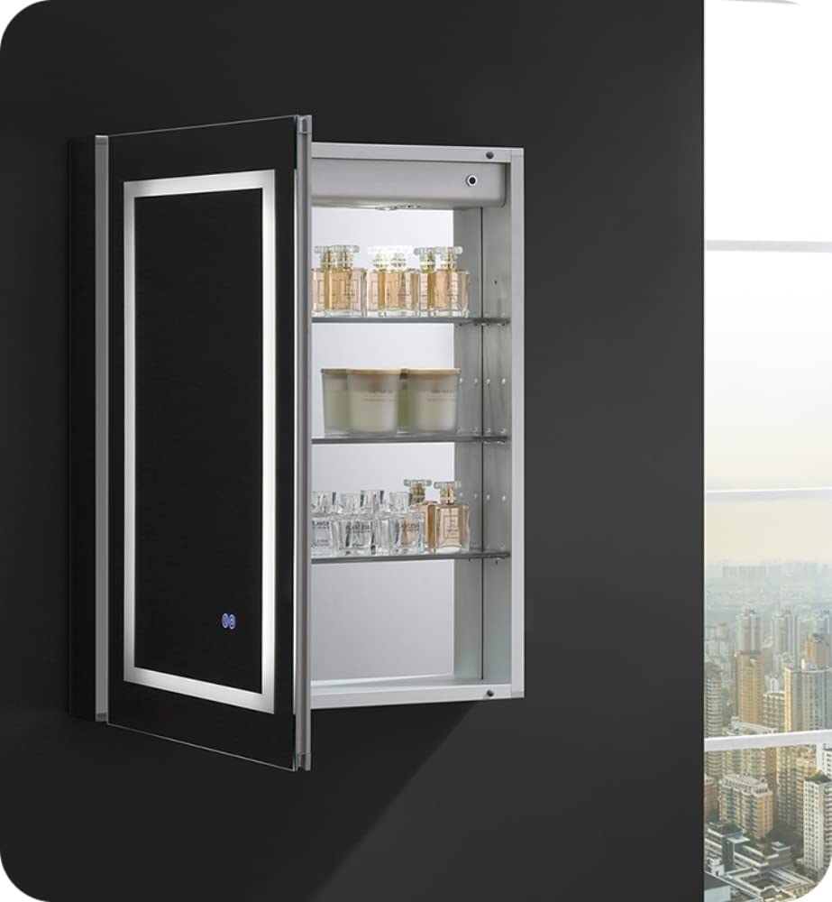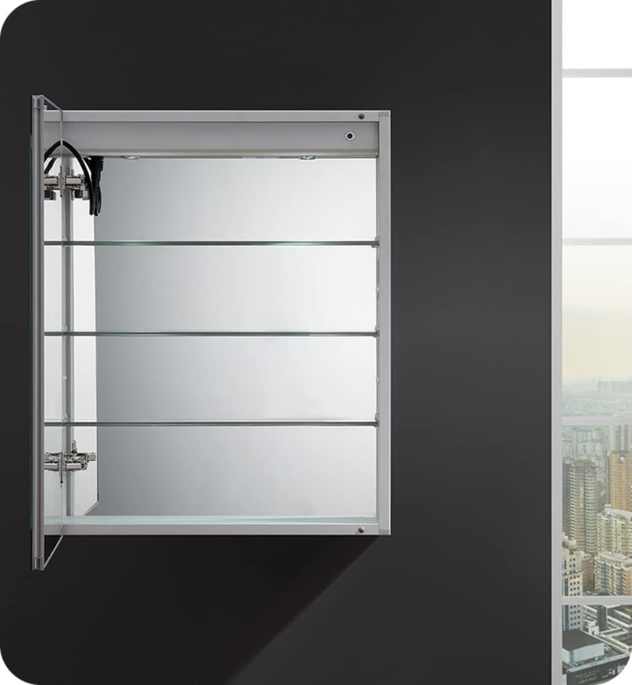The Fresca Bathroom Medicine Cabinet comes with everything you need to create an elegant and modern bathroom, with every convenience right in front of you. On the outside, its a sophisticated mirrored medicine cabinet with a built-in dimmable surface LED task light which creates an illuminated frame within the mirror. It also has a defogger feature. Inside, theres an LED light and a handy electrical/USB outlet combo for an electric shaver, toothbrush or other essentials. The interior features three adjustable glass shelves and a mirrored back wall. The double-sided mirrored door swings right on 170 degree, soft-close BLUM hinges. Measuring 24"W x 30"H x 5"D, this medicine cabinet is available in several sizes.
