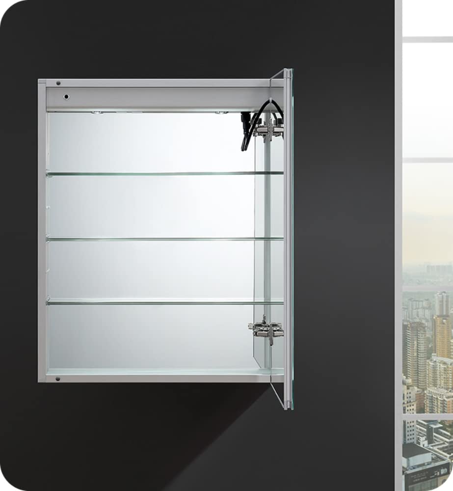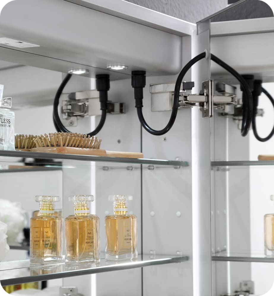The Fresca Bathroom Medicine Cabinet comes with everything you need to create an elegant and modern bathroom, with every convenience right in front of you. On the outside, its a sophisticated mirrored medicine cabinet with a built-in dimmable surface LED task light which creates an illuminated frame within the mirror. It also has a defogger feature. Inside, theres an LED light and a handy electrical/USB outlet combo for an electric shaver, toothbrush or other essentials. The interior features three adjustable glass shelves and a mirrored back wall. The double-sided mirrored door swings left on 170 degree, soft-close BLUM hinges. Measuring 24"W x 30"H x 5"D, this medicine cabinet is available in several sizes.