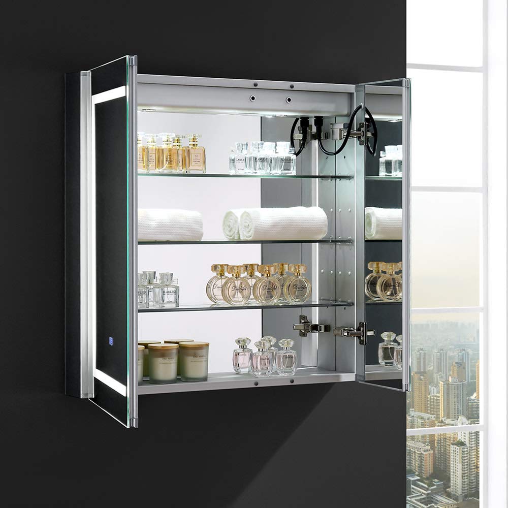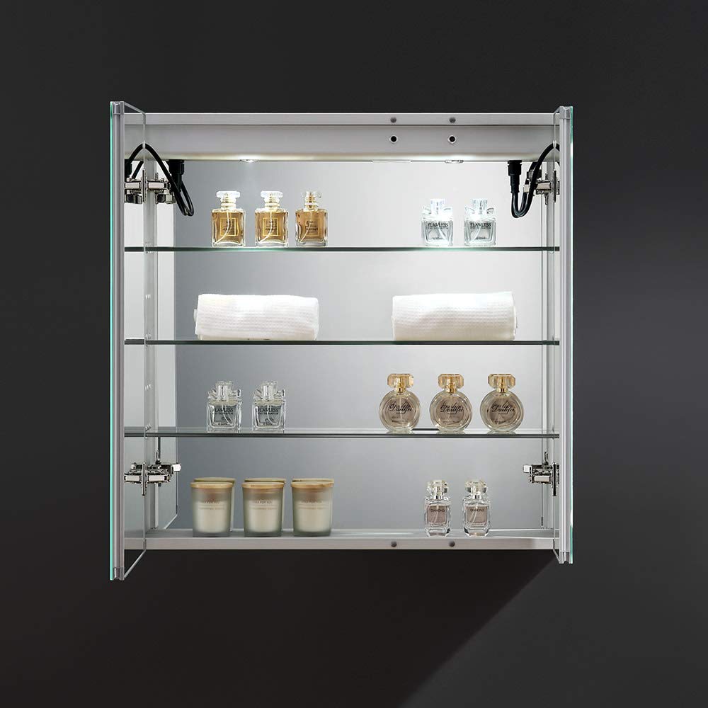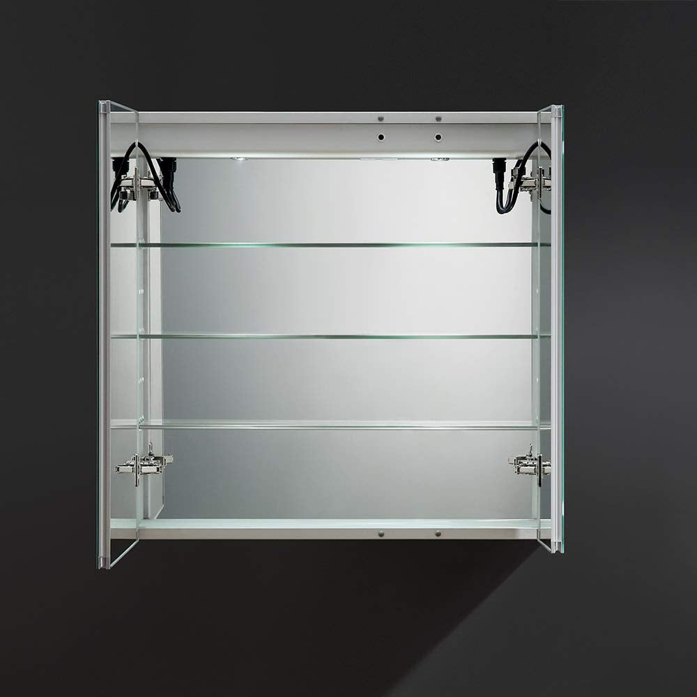 The Fresca Bathroom Medicine Cabinet comes with everything you need to create an elegant and modern bathroom, with every convenience right in front of you. On the outside, it’s a sophisticated mirrored medicine cabinet with a built-in dimmable surface LED task light which creates an illuminated frame within the mirror. It also has a defogger feature. Inside, there’s an LED light and a handy electrical/USB outlet combo for an electric shaver, toothbrush or other essentials. The interior features three adjustable glass shelves and a mirrored back wall. The double-sided mirrored doors swing 170 degrees on soft-close BLUM hinges. Measuring 30"W x 30"H x 5"D, this medicine cabinet is available in several sizes.