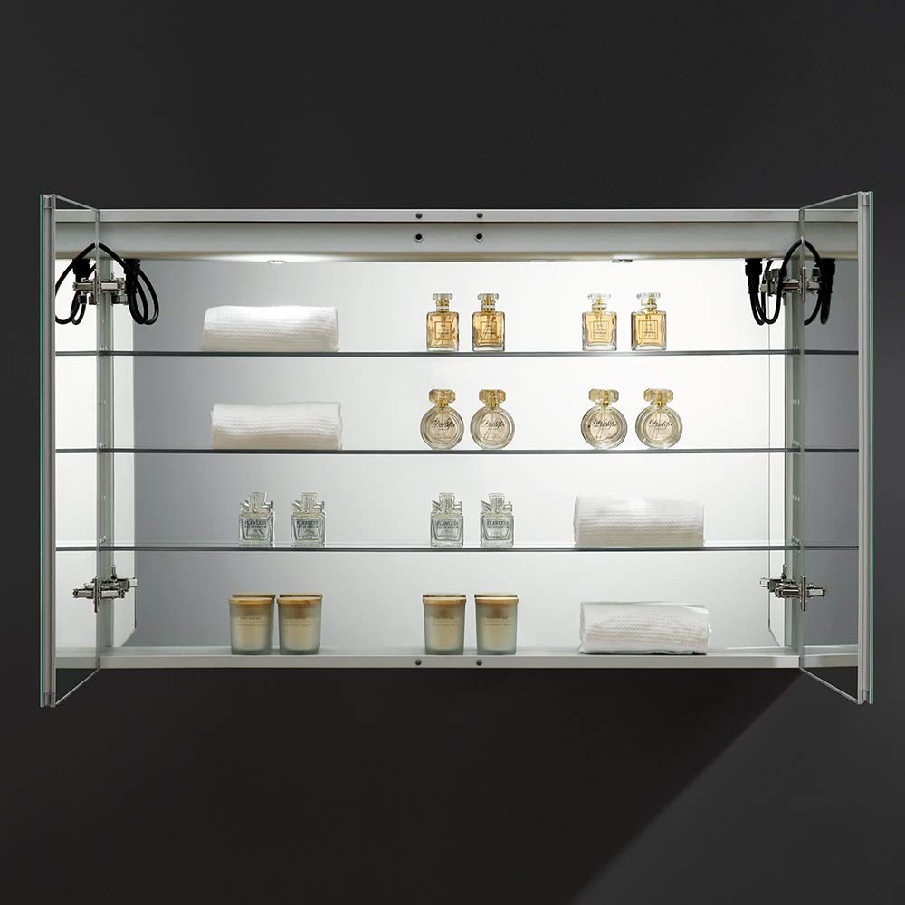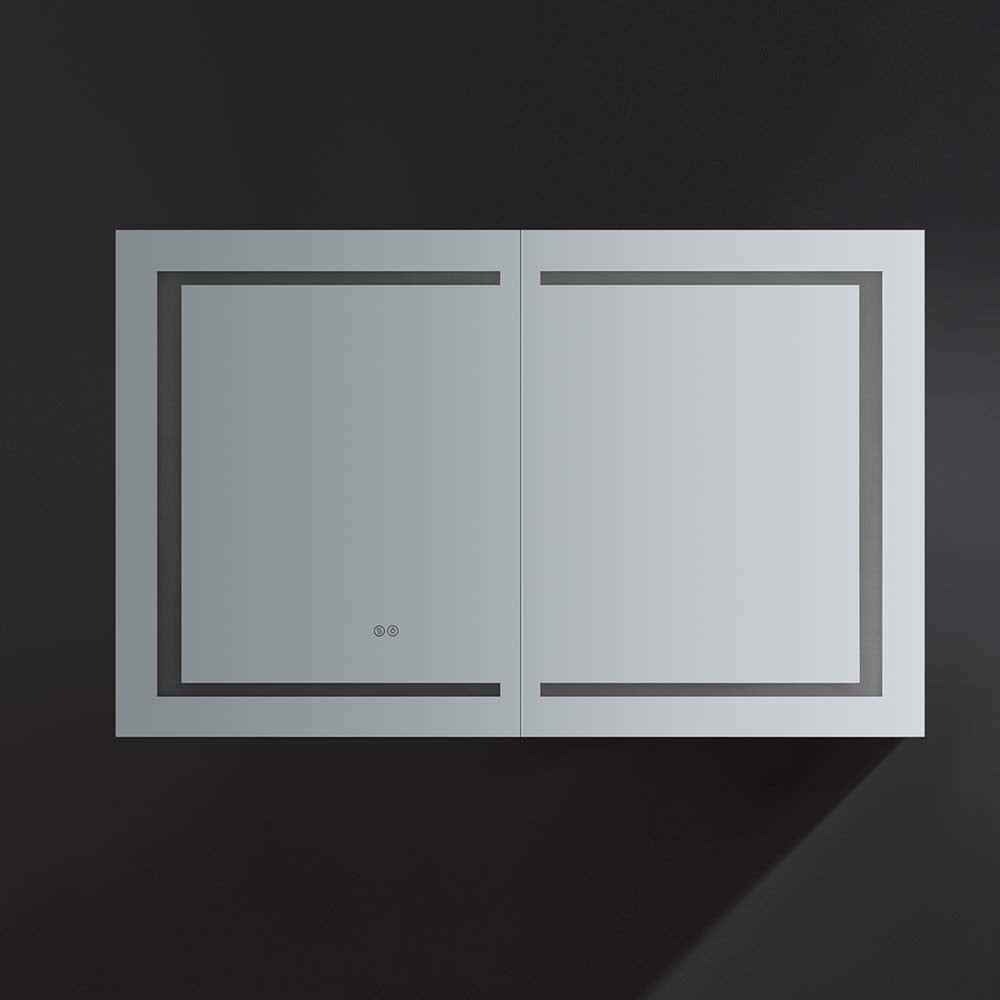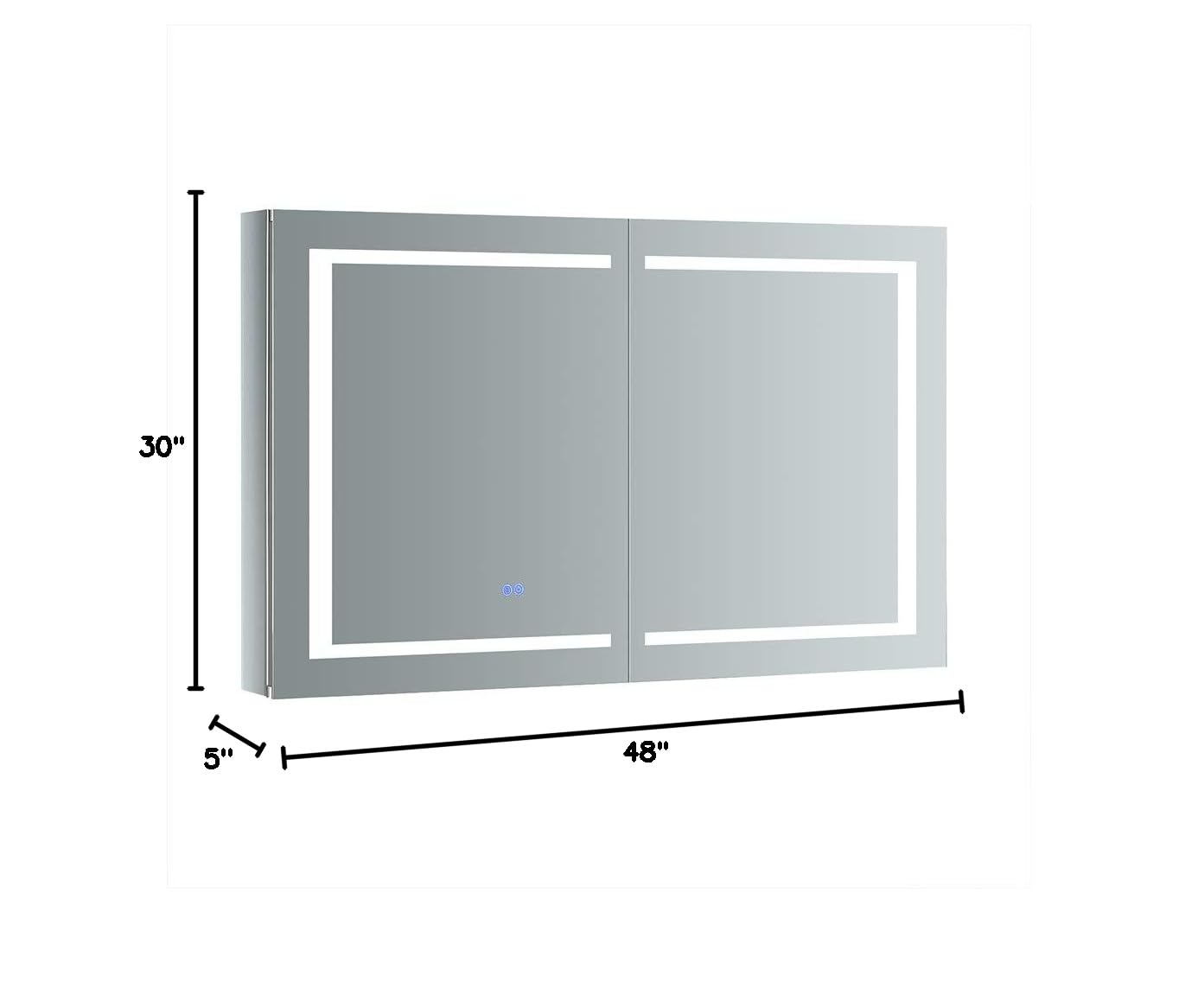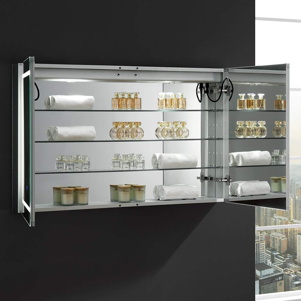 The Fresca Bathroom Medicine Cabinet is a brilliant combination of elegant style and modern convenience. On the outside, it's a sophisticated, mirrored medicine cabinet with a built-in dimmable surface LED task light which creates an illuminated frame within the mirror. There's a touch switch for the light as well as a defogger feature.Inside, you'll find three adjustable glass shelves ideal for holding items of varying sizes. The double-sided mirrored doors swing 170 degrees on soft-close BLUM hinges and the back wall of the cabinet is also mirrored. An interior infrared touch switch allows you to find what you're looking for at any hour, with an interior LED light. There's also a handy electrical/USB outlet combo inside for an electric shaver, toothbrush or other essentials, making your morning and evening grooming tasks easier than ever. Showcasing a simple silver mirror and neutral design, the Fresca Bathroom Medicine Cabinet will beautifully complement any décor. It can be wall mounted or recessed and features an anodized aluminum frame which creates a moisture and dust resistant interior. The mirrored doors have plastic corners. This medicine cabinet measures 48"W x 30"H x 5"D and is available in various sizes