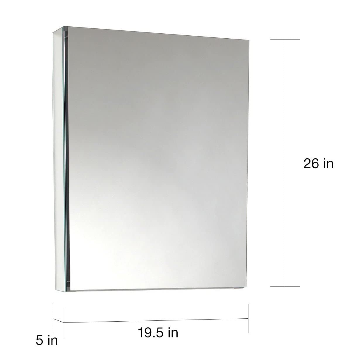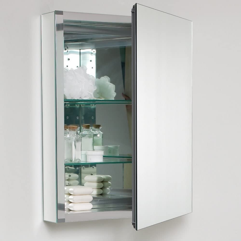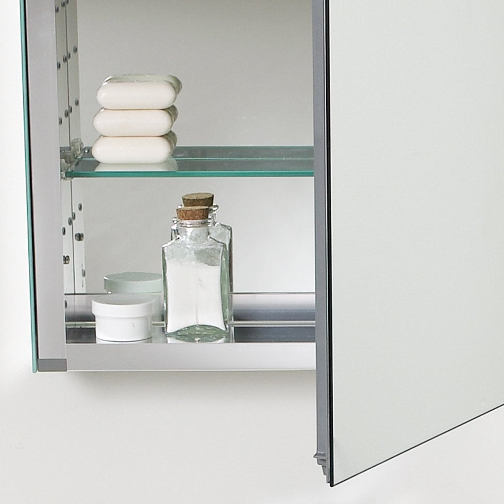 This 20" medicine cabinet features mirrors everywhere. The edges have mirrors and also on the interior of the medicine cabinet. The inside features two tempered glass shelves. Can be wall mounted or recessed into the wall.