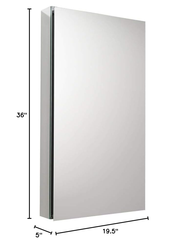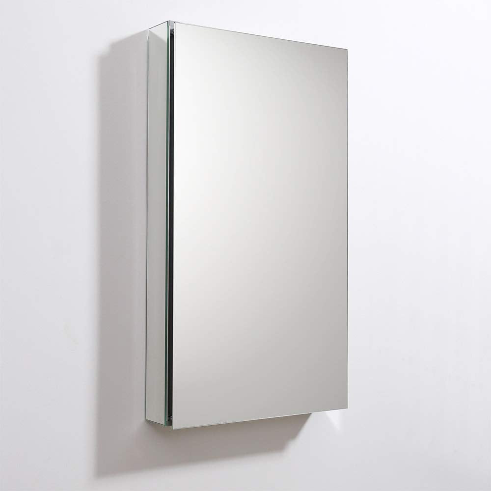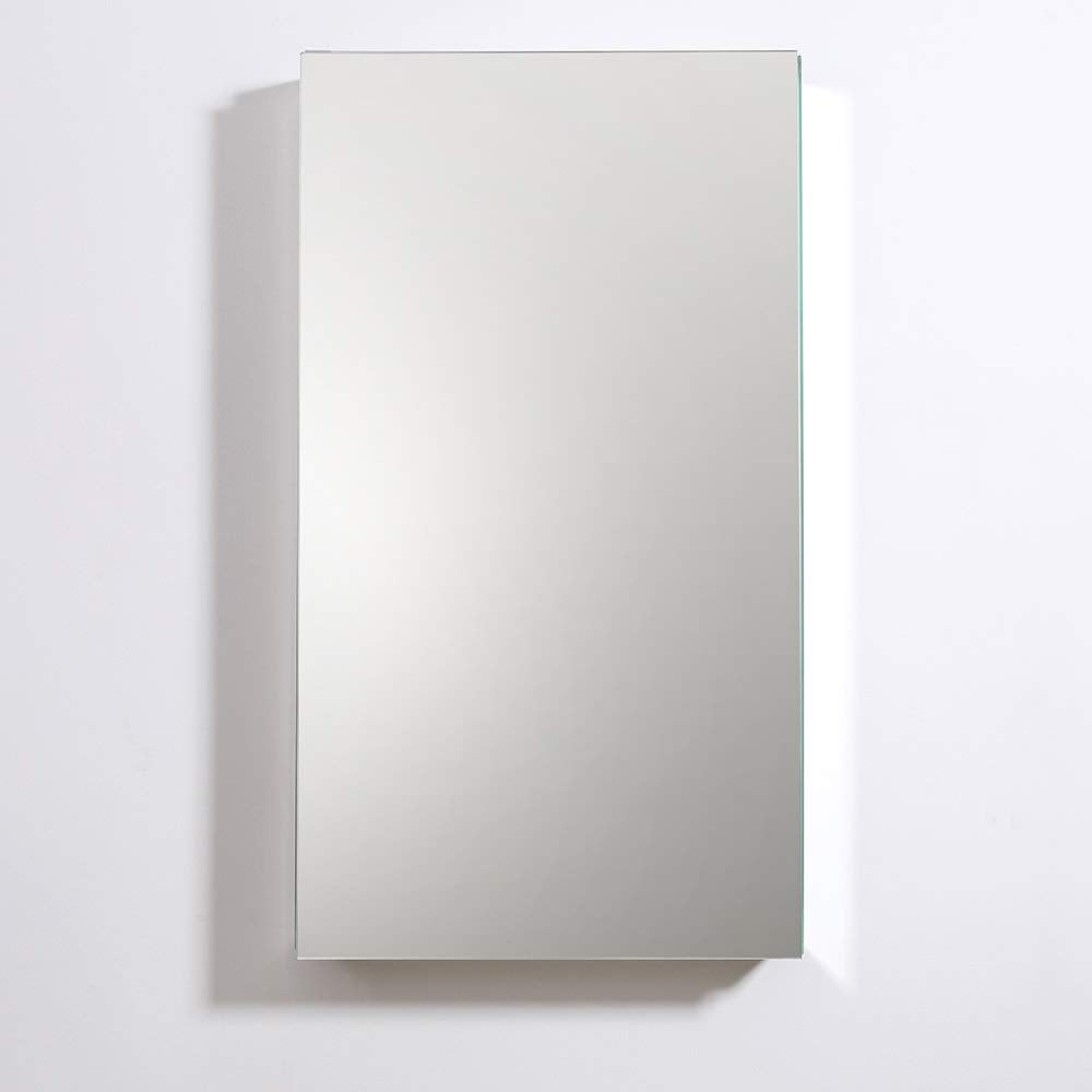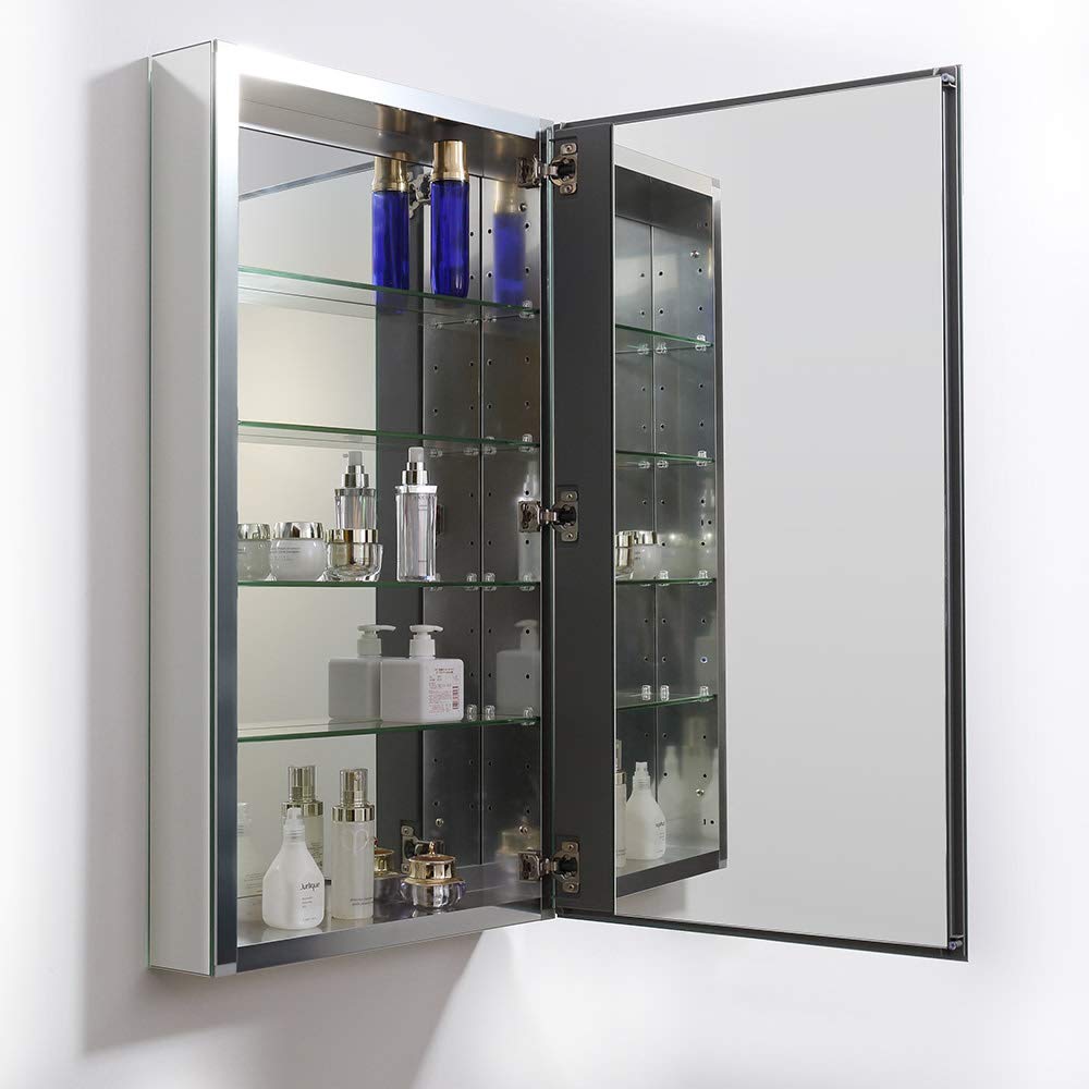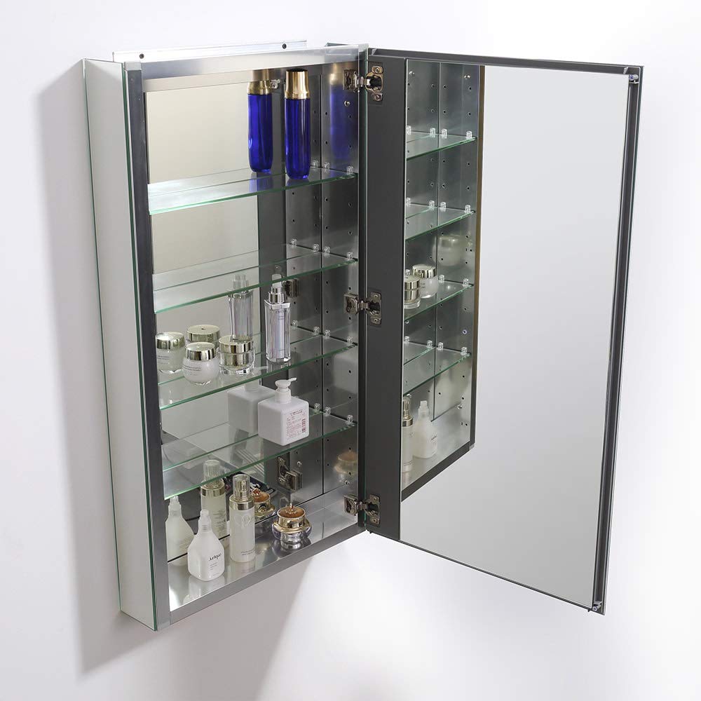 This stylish rectangular bathroom medicine cabinet has a contemporary frameless design. The mirrored door opens to reveal a second mirror at the back of the cabinet and four adjustable glass shelves that can accommodate items of varying heights. An anodized aluminum frame creates a moisture and dust resistant interior.