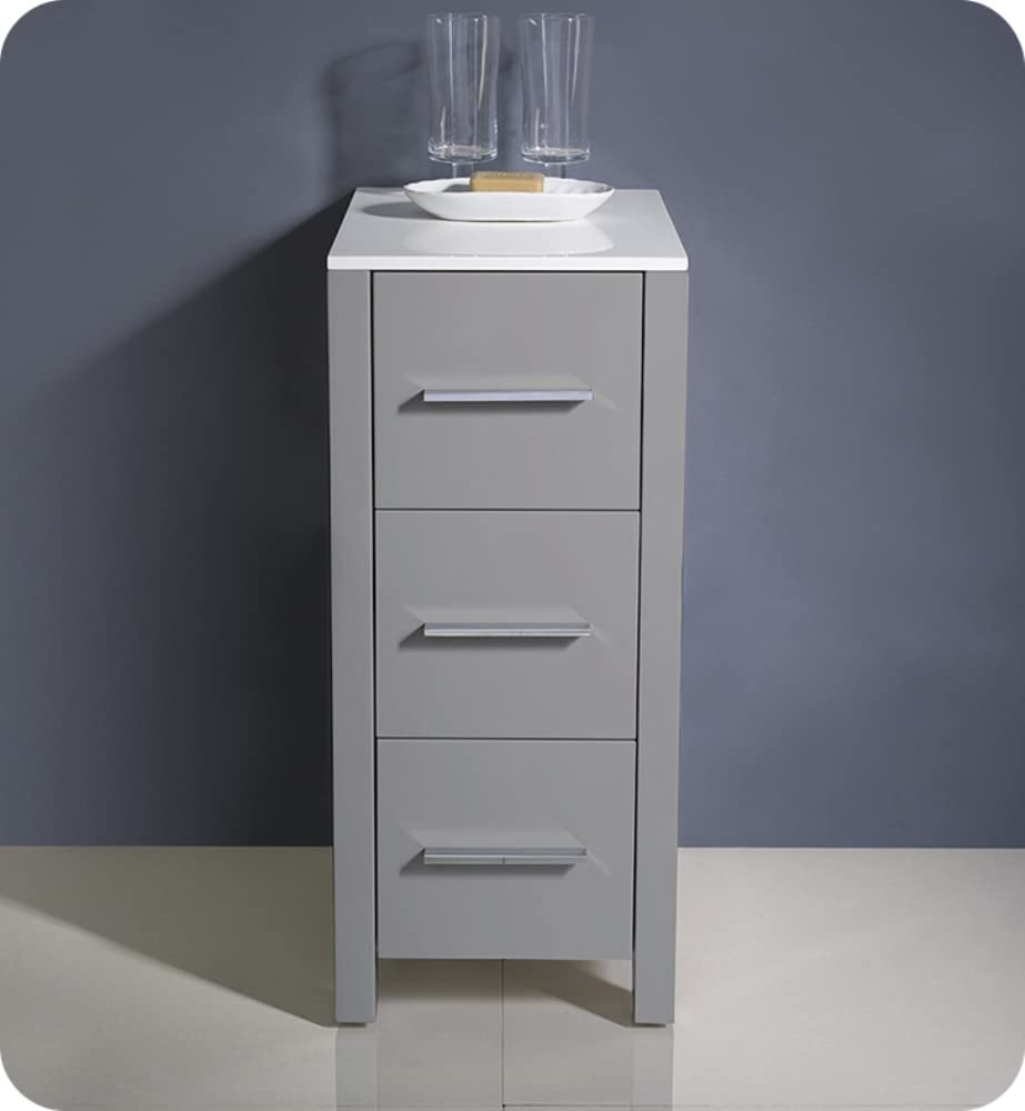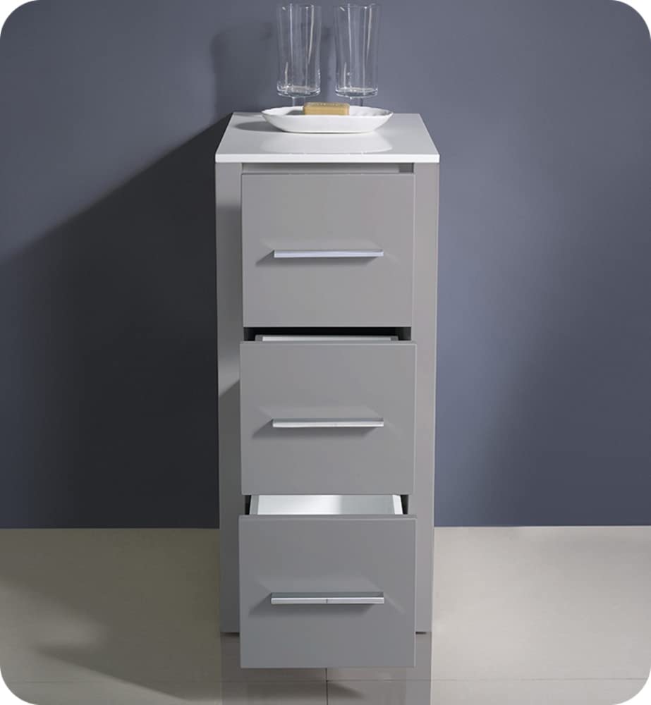 This side cabinet comes in an gray finish. It has 3 spacious drawers and a sleek glass/stone composite countertop. Perfect match for all Fresca Torino "Gray" vanities.