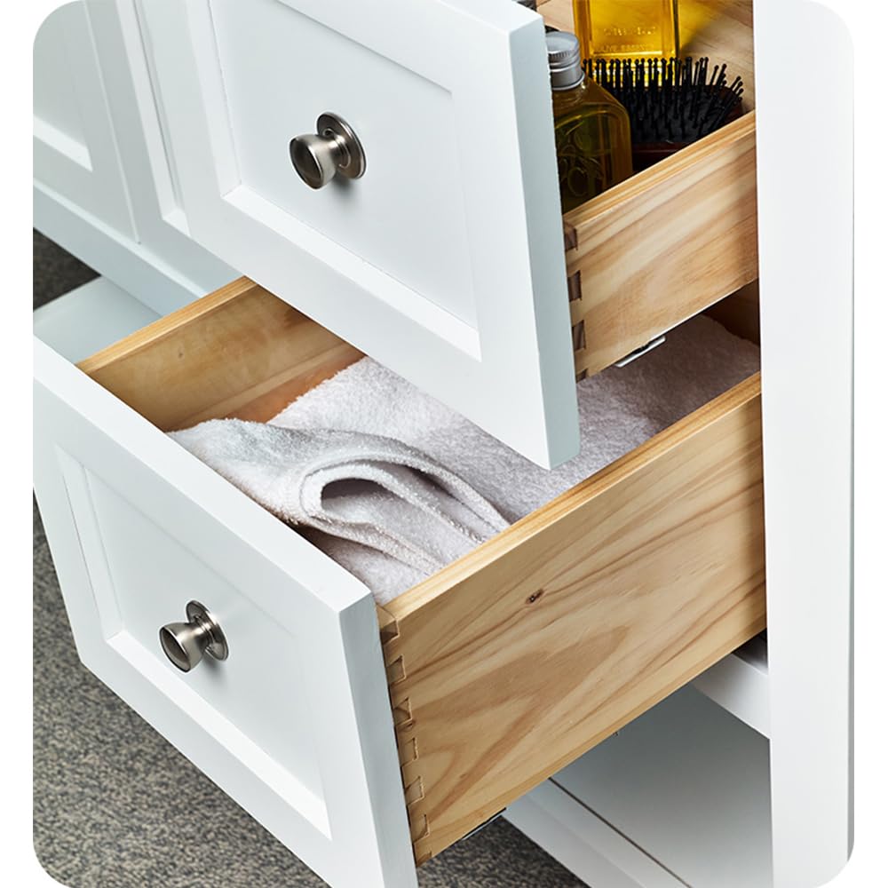 Brighten your bathroom with the clean, timeless design of our Fresca Manchester 36 Traditional Bathroom Vanity. This beautifully constructed vanity features panelled solid wood doors with soft close hinges to ensure they close silently and effortlessly every time. There are two soft closing drawers that offer ample space for your bathroom essentials and an open bottom shelf for storing towels and additional bath supplies. This traditional vanity features a fresh, painted White finish and brushed nickel handles. The lovely white ceramic sink has a rounded basin and is equipped with an integrated overflow. The countertop has been pre-drilled to accommodate a single hole faucet (included). A p-trap, pop-up drain and installation hardware are also included. This stylish vanity comes with a matching Fresca Manchester 30 Traditional Bathroom Mirror to complete the look. The solid wood mirror has a simple yet elegant frame and features a painted White finish.