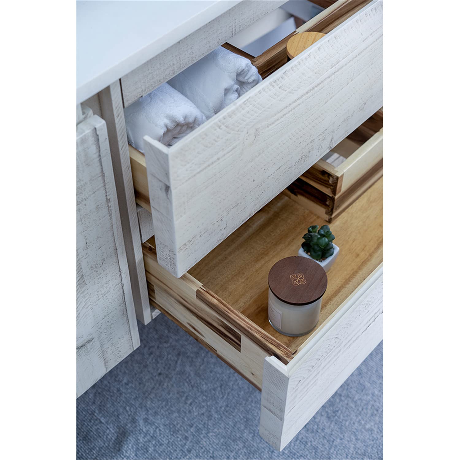 - Materials: Solid Acacia Wood Construction, Quartz Stone Countertop, Ceramic Undermount Sink w/ Overflow
