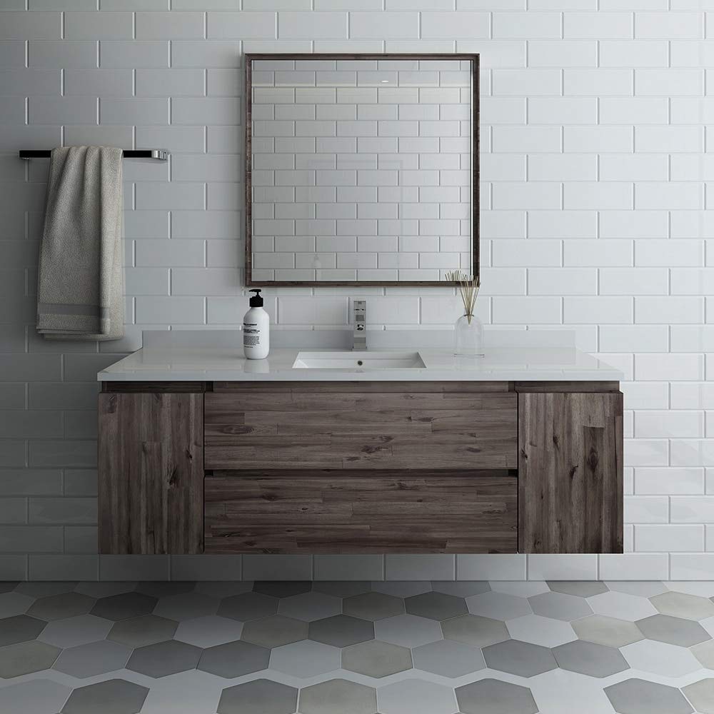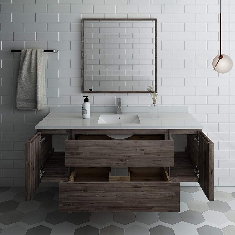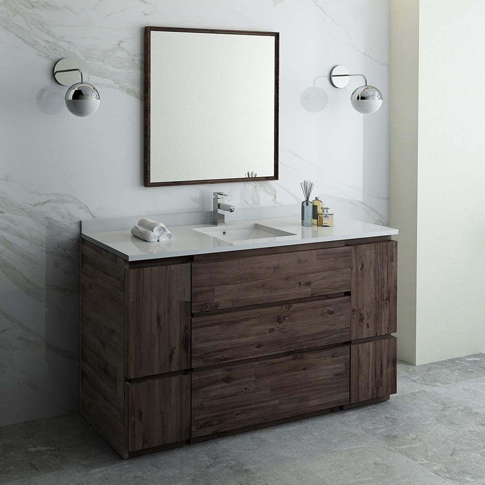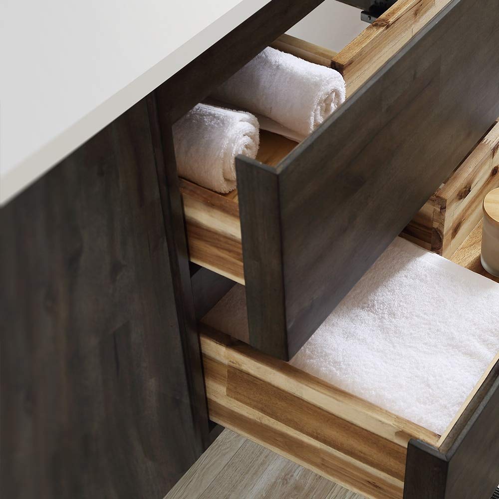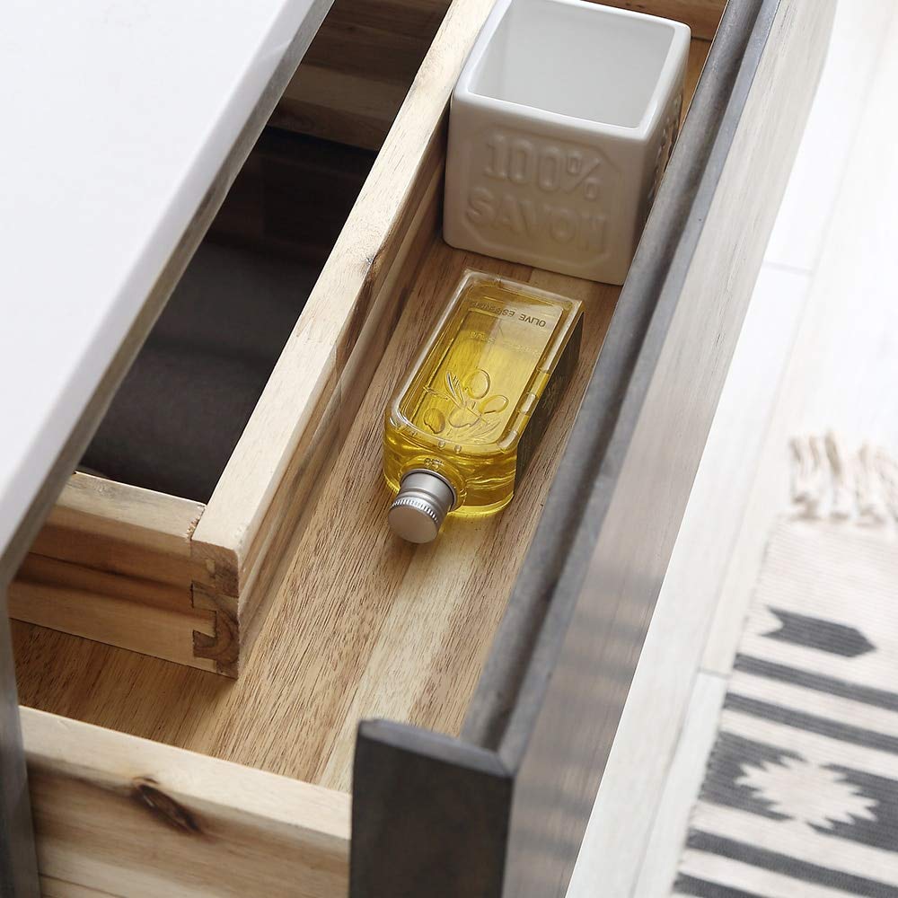 - Materials: Solid acacia wood construction, quartz stone countertop, ceramic undermount sink with overflow